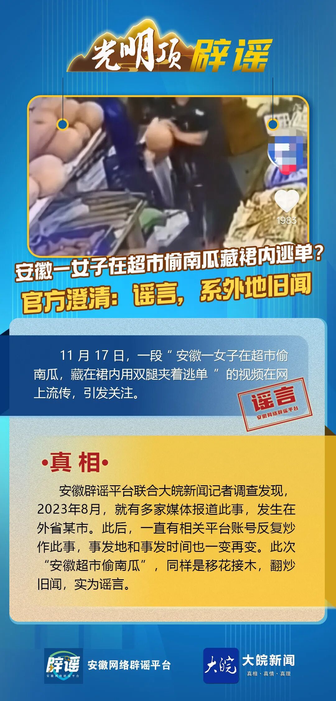 光明顶辟谣 | 安徽一女子在超市偷南瓜藏裙内逃单?官方澄清:谣言,系外地旧闻