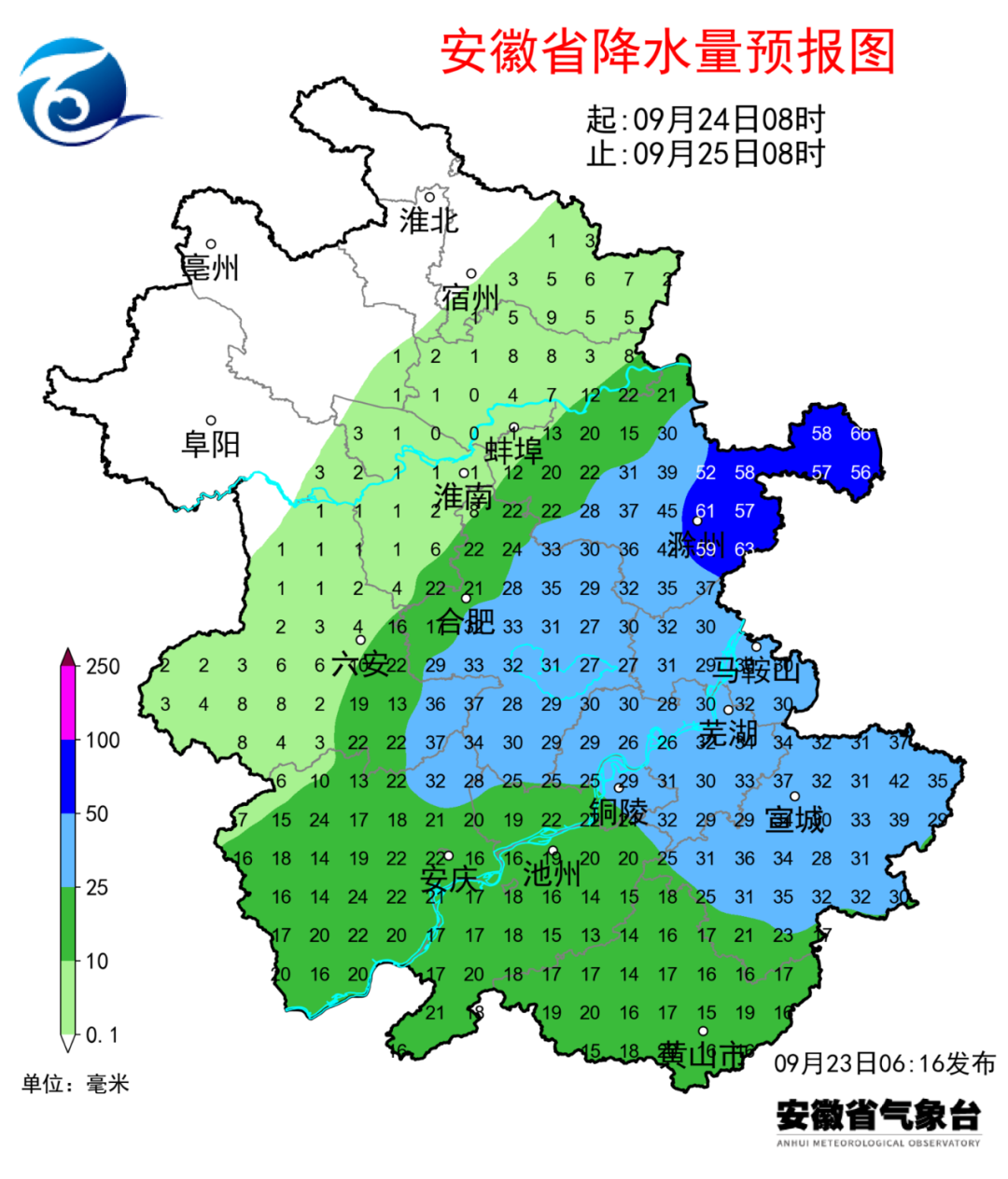 24日:淮北地区阴天转多云;沿淮淮河以南阴天有小到中等阵雨或雷雨,部分地区大雨,局部暴雨。