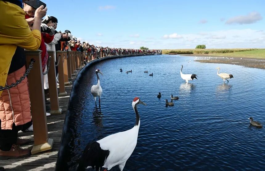 游客在黑龙江齐齐哈尔扎龙生态旅游区观赏丹顶鹤。齐齐哈尔市委宣传部供图