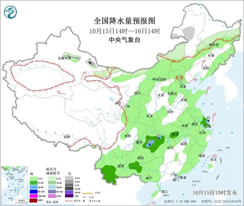 与此同时,冷空气南下与暖湿气流交汇,今起三天(10月15日至17日),华西至黄淮一带继续维持多雨格局,需持续警惕各类次生灾害。