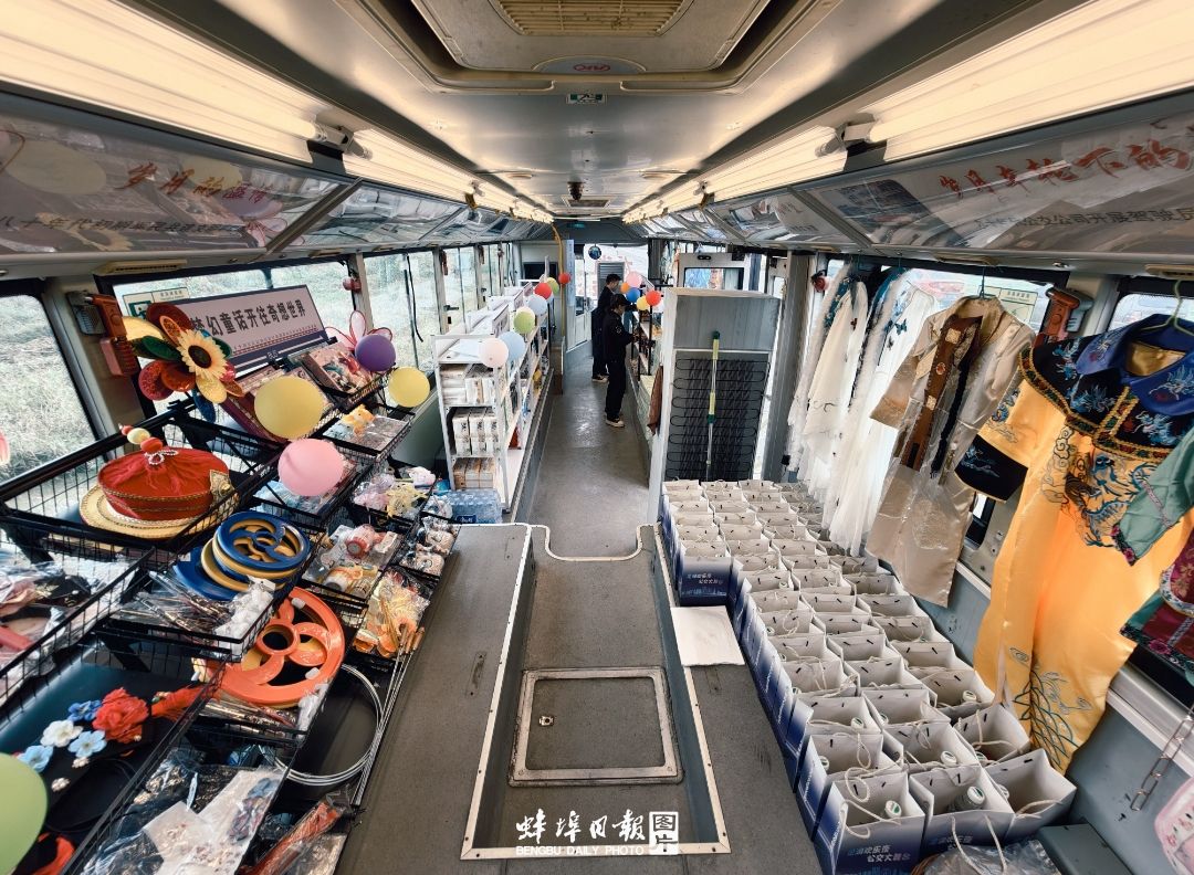 走进驿站,改造巧思随处可见。车身保留了经典的公交轮廓,车内则配备了空调与冰柜,营造出舒适的购物环境。货架上,从洗发水、沐浴露等日常用品,到本地土特产、饮料零食一应俱全,充分满足了不同的消费需求。此外,驿站还特别准备了多套古风、休闲风拍照服装,结合车身外绘制的“龙湖风景+公交元素”彩绘,使其迅速成为游客驻足留念的热门背景。