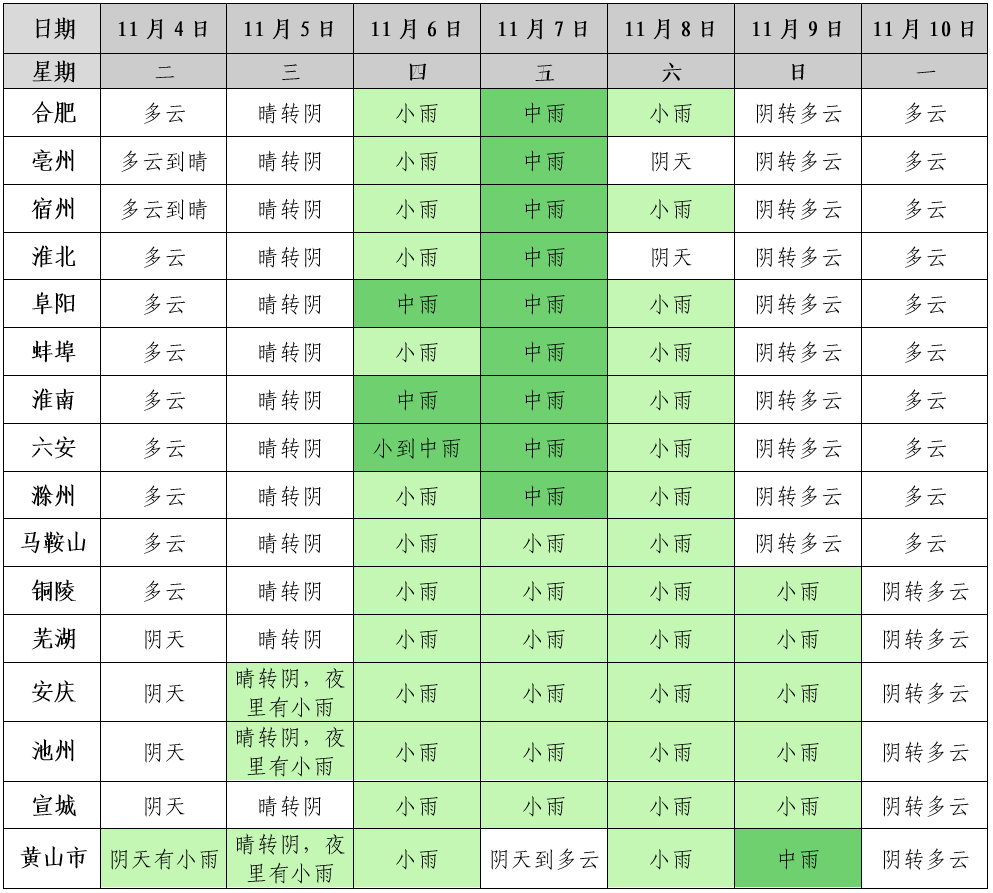 雨水也将到来。预计今天全省以多云天气为主,仅江南南部有小雨;5日夜里至9日安徽省多阴雨天气。10日全省再次转为多云天气。