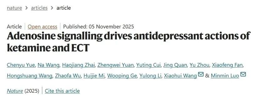 北京时间11月6日零时,国际权威学术期刊《自然》在线发表了我国科学家在抑郁症治疗研究领域的重要突破:首次揭示氯胺酮和电休克疗法这两种快速强效抗抑郁疗法背后的共同作用机制——腺苷信号通路。这一发现不仅揭开了快速抗抑郁治疗机制长期不明的“黑箱”,更为开发更安全、高效的新型治疗方案提供了明确路径。