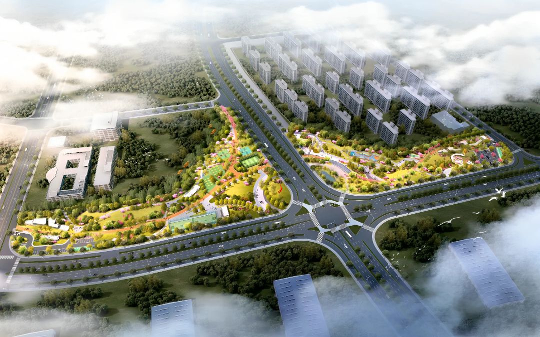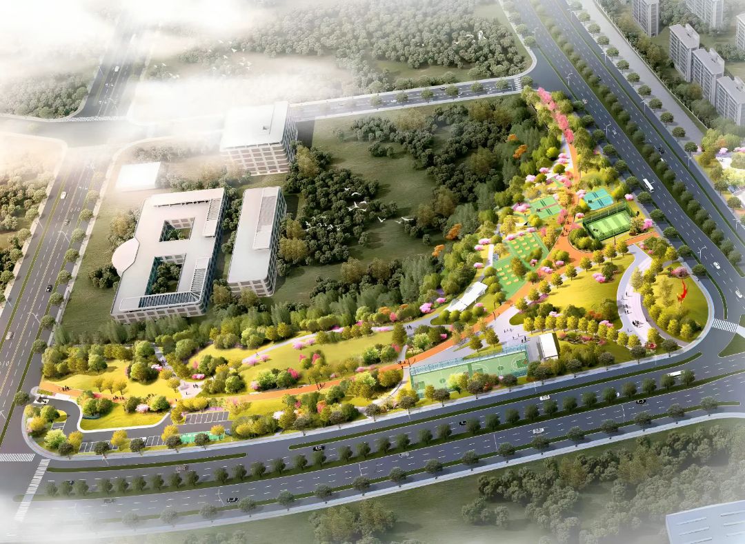 蚌埠自贸区体育公园项目位于高新区黄山大道与中粮大道交汇处,整体由A、B两个地块组成,总占地面积约54742㎡,南北两侧地块通过人行道连通。项目以“绿意”“活力”为核心主题,结合场地原有地形,通过“悦动绿脉”景观轴线串联起生态绿化区、体育健身设施区及智慧停车区三大功能板块,推动绿色空间与健身设施深度融合。
