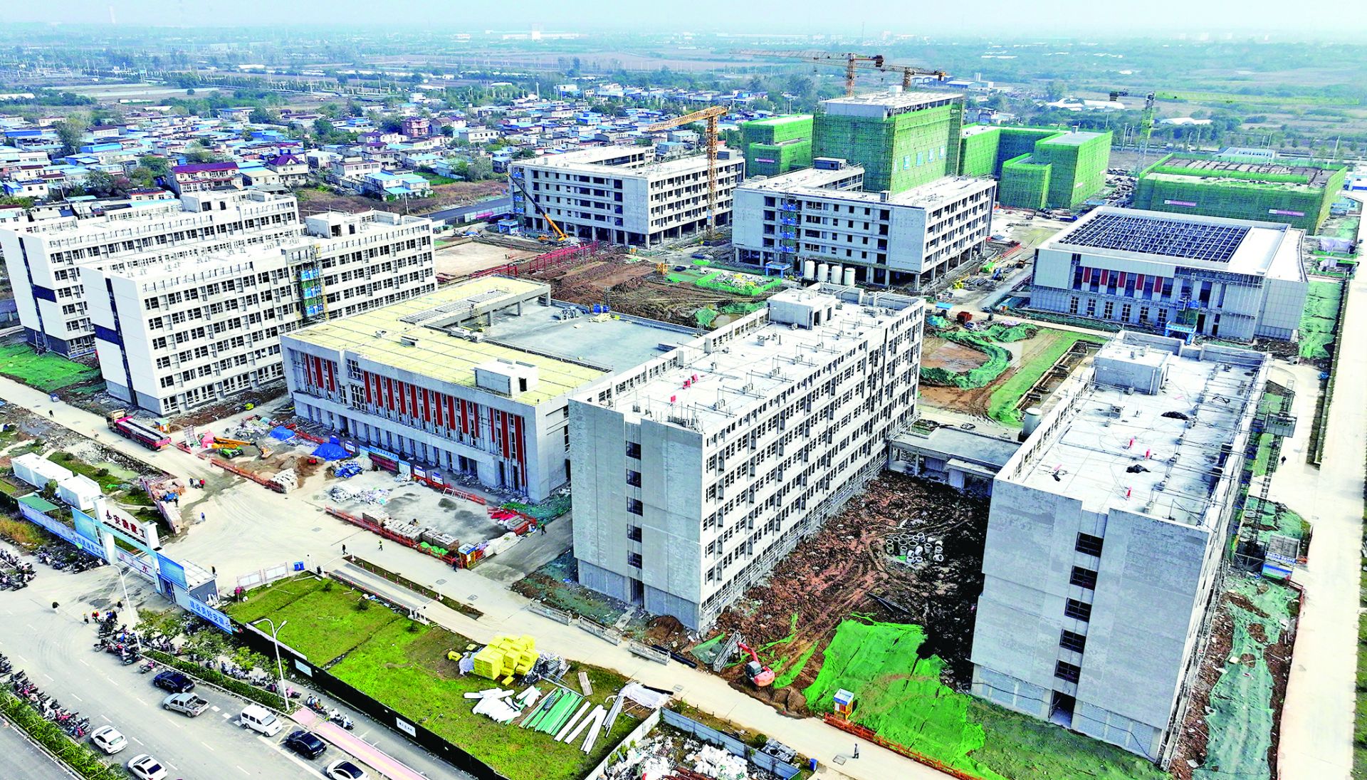 11月10日,蚌埠一中新校区规模显现,建筑工人正在加紧作业。该项目位于经开区临港片区,司马庄路以西、锥子山路以东,总建筑面积约12万平方米,包括教学楼、教学综合楼等。据介绍,按照施工进度,所有单体本周封顶,年底之前基本完成内外装饰。(记者 刘晨 摄) 0