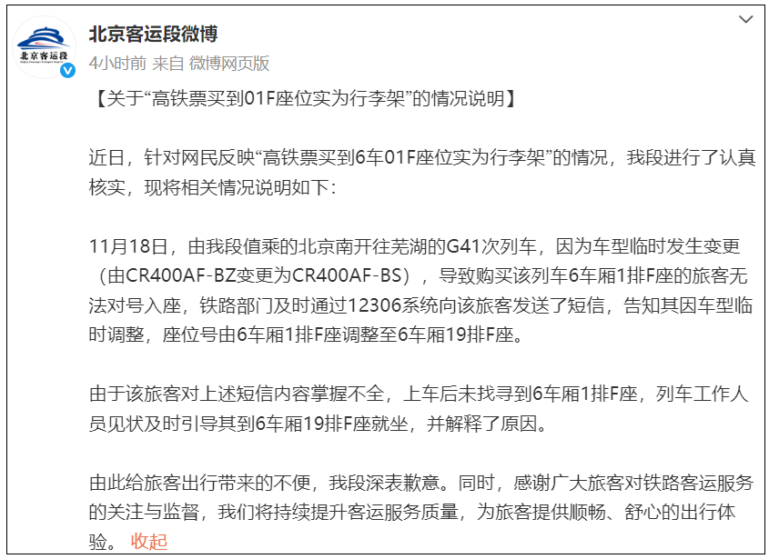 11月19日,@北京客运段 发布关于“高铁票买到01F座位实为行李架”的情况说明。