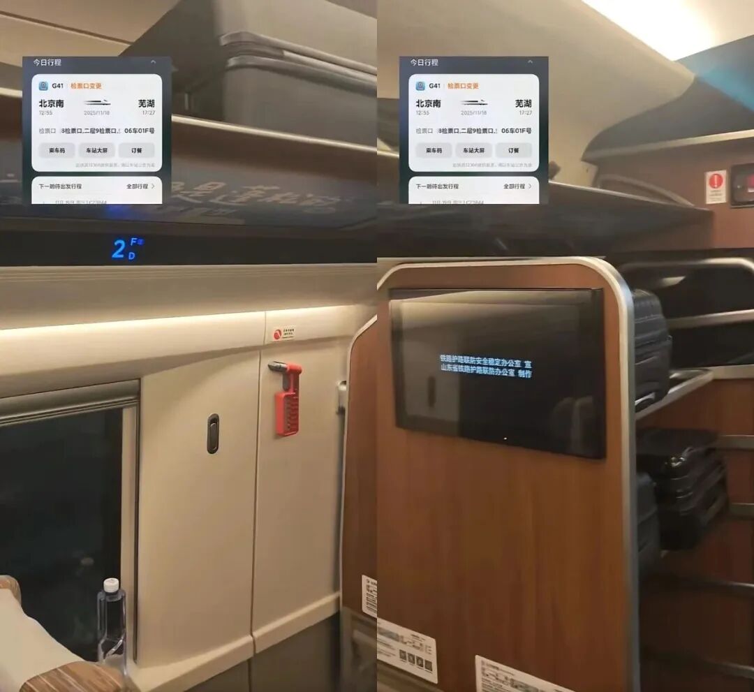 11月18日,由北京客运段值乘的北京南开往芜湖的G41次列车,因为车型临时发生变更(由CR400AF-BZ变更为CR400AF-BS),导致购买该列车6车厢1排F座的旅客无法对号入座,铁路部门及时通过12306系统向该旅客发送了短信,告知其因车型临时调整,座位号由6车厢1排F座调整至6车厢19排F座。