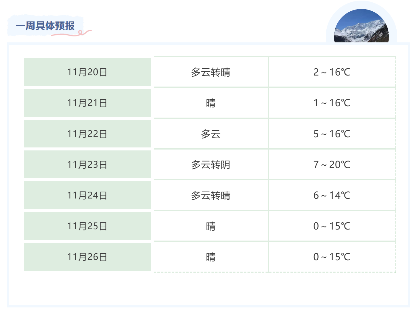 随着冷空气影响减弱,阳光重新掌控天气舞台,我市气温步入回升通道。具体来看,21-22日持续晴好,最低气温在1-2℃,最高气温稳定在16℃。值得注意的是,11月22日正值“小雪”节气。“小雪”是二十四节气中的第20个节气,冬季第2个节气,时间在每年公历11月22或23日,即太阳到达黄经240°时。小雪是反映降水与气温的节气,它是寒潮和强冷空气活动频数较高的节气。小雪节气的到来,意味着天气会越来越冷、降水量渐增。