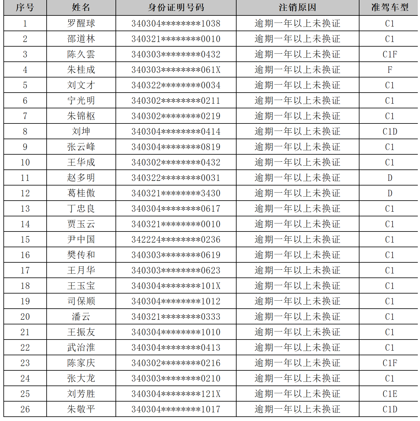 根据《机动车驾驶证申领和使用规定》(公安部第172号令)第七十九条第一款第八项,超过机动车驾驶证有效期一年以上未换证的,应当注销其机动车驾驶证以及第二款未收回机动车驾驶证的,应当公告机动车驾驶证作废,现公告以下驾驶人的机动车驾驶证作废。 蚌埠市公安局交通管理支队 0