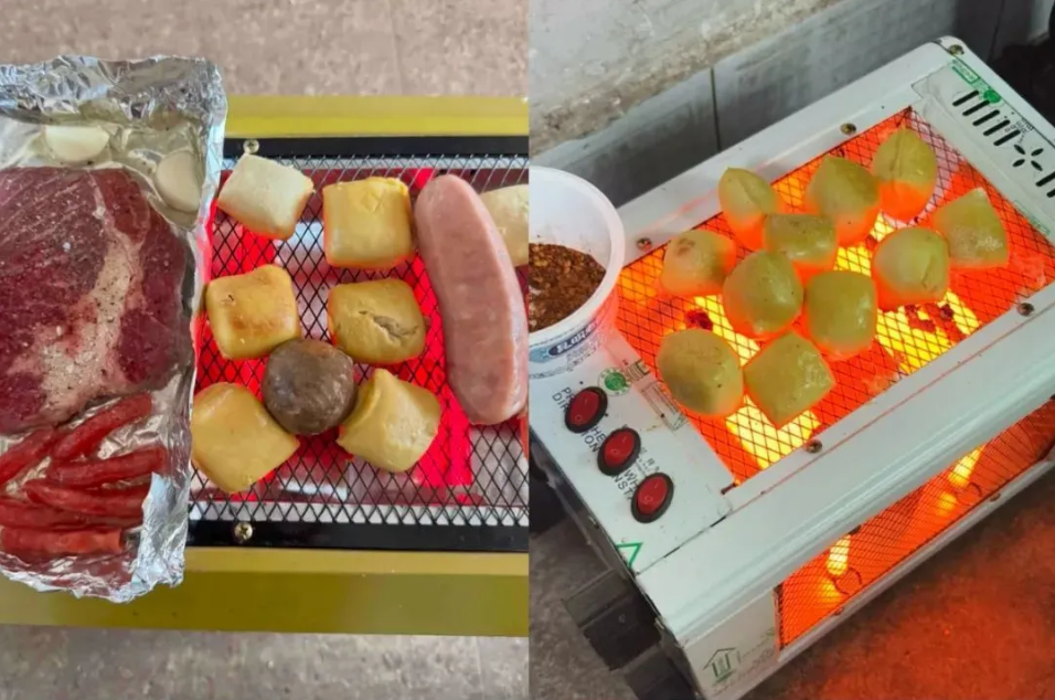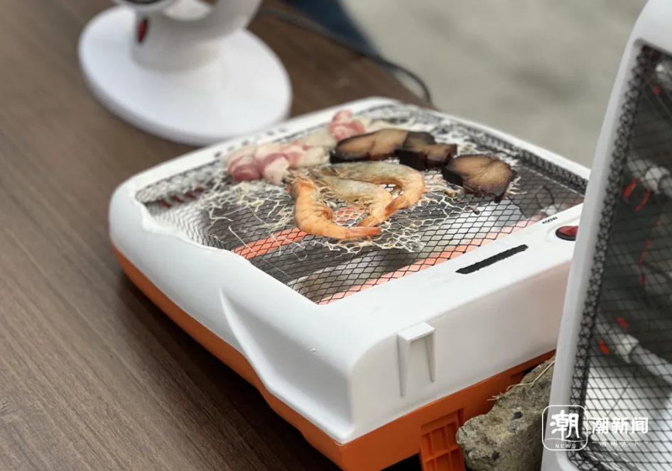 电暖器打开后,消防员使用测温枪对设备内部进行测温。温度计显示,电暖器打开1分钟后,设备内部的发热管中心温度达到了600℃。大约5分钟,放在电暖器表面的虾、肉等就熟了,猪肉和腊肉在高温的作用下开始冒油。