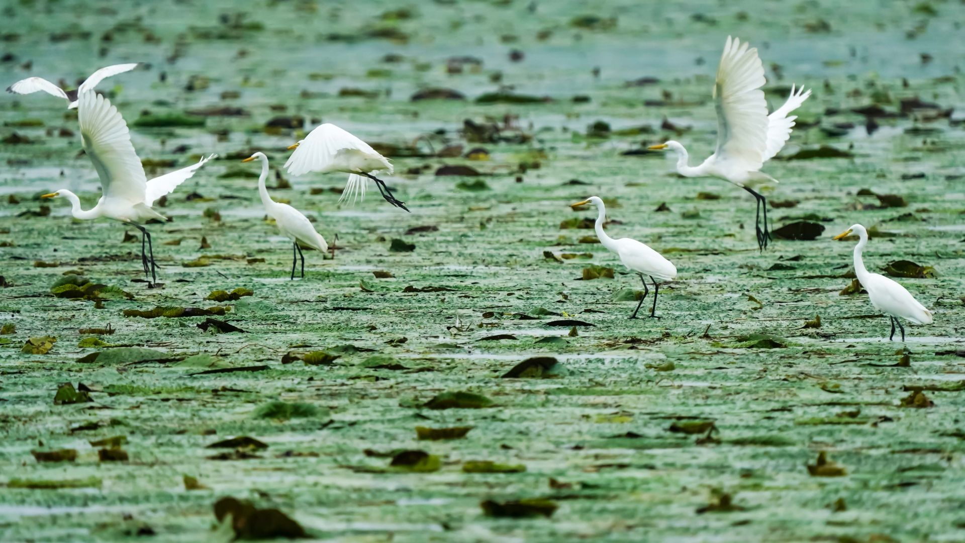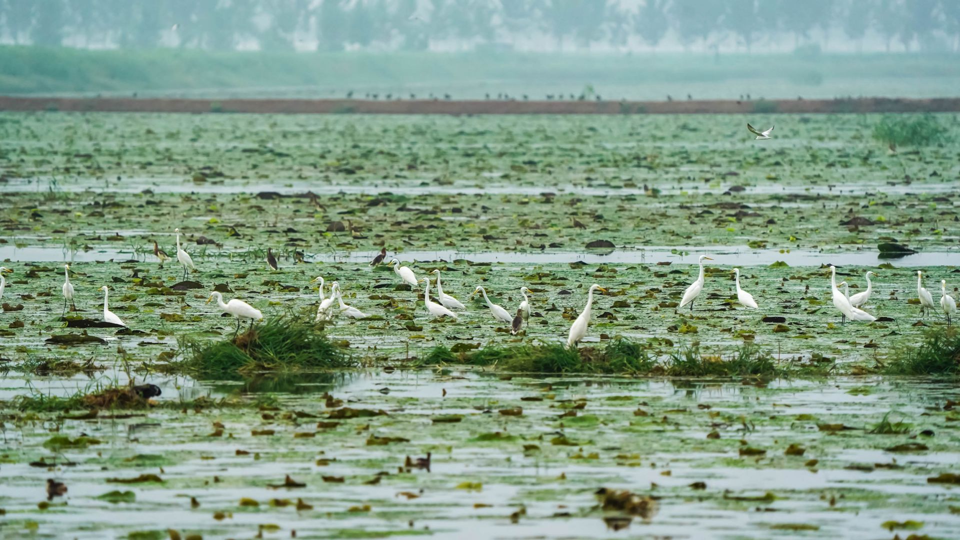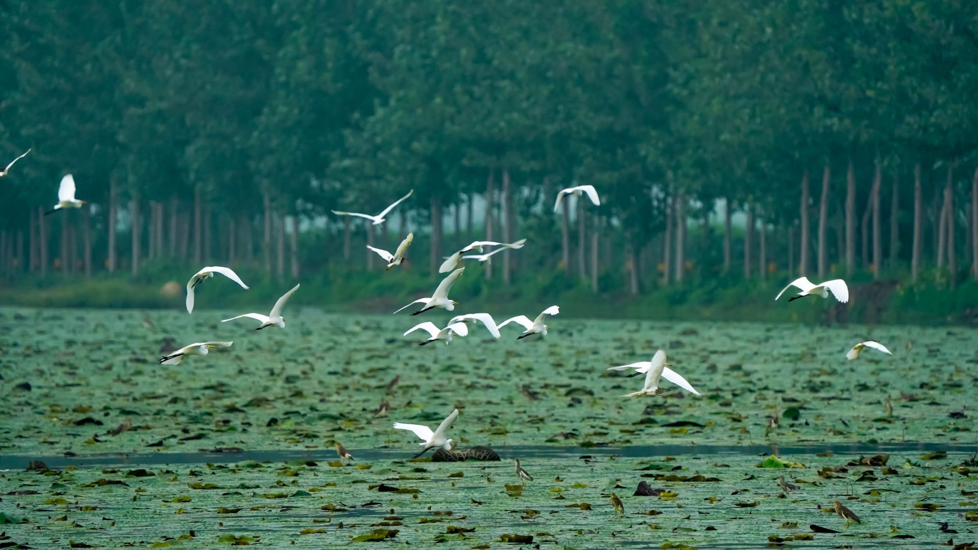 初秋,在大河湾的芡实塘里,有几十只白鹭、池鹭在芡实的叶面上捕捉芡实塘的鱼虾吃,洁白的羽毛与绿色的芡实叶共绘出一幅美丽的生态画卷。 李思 摄