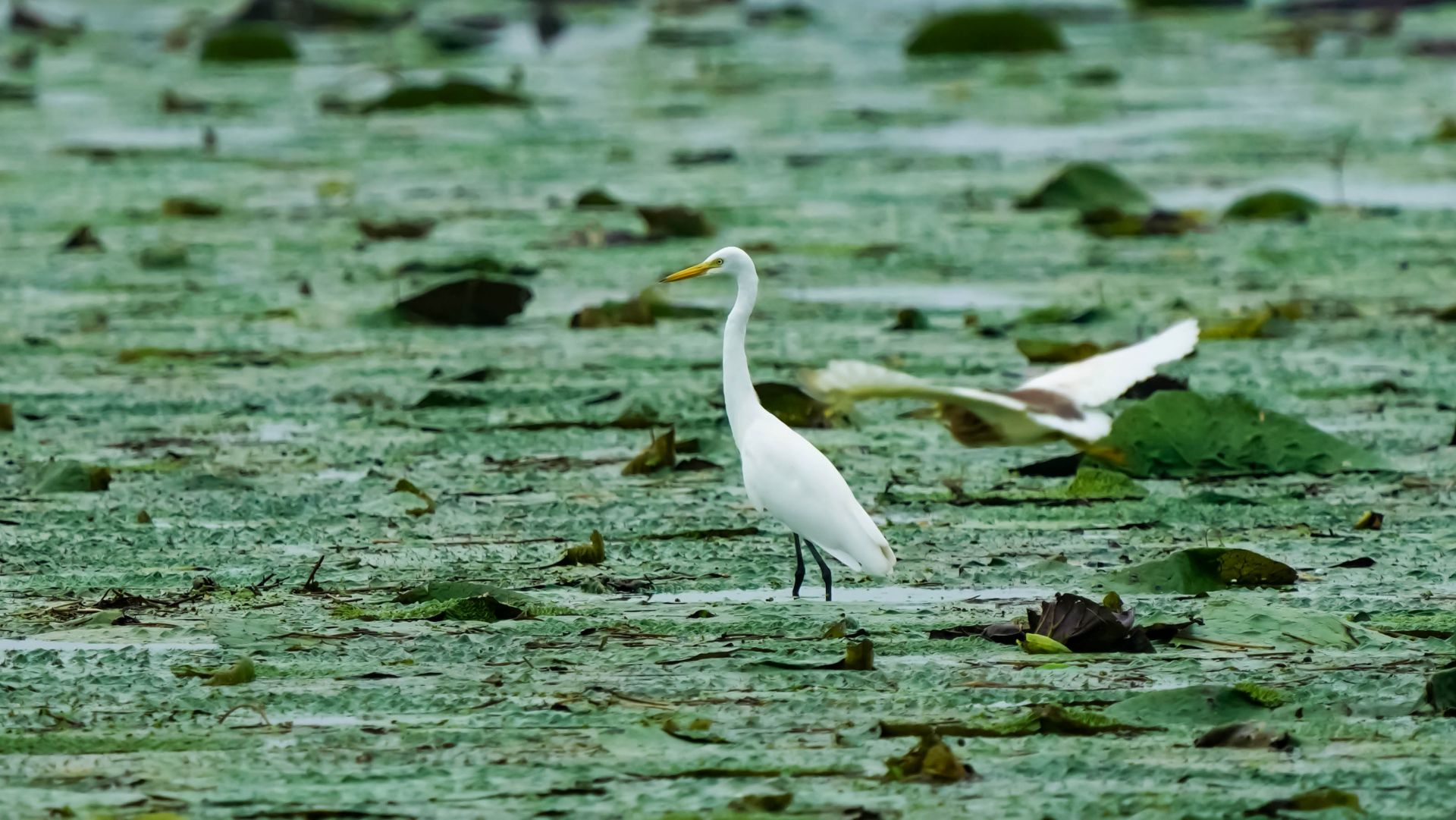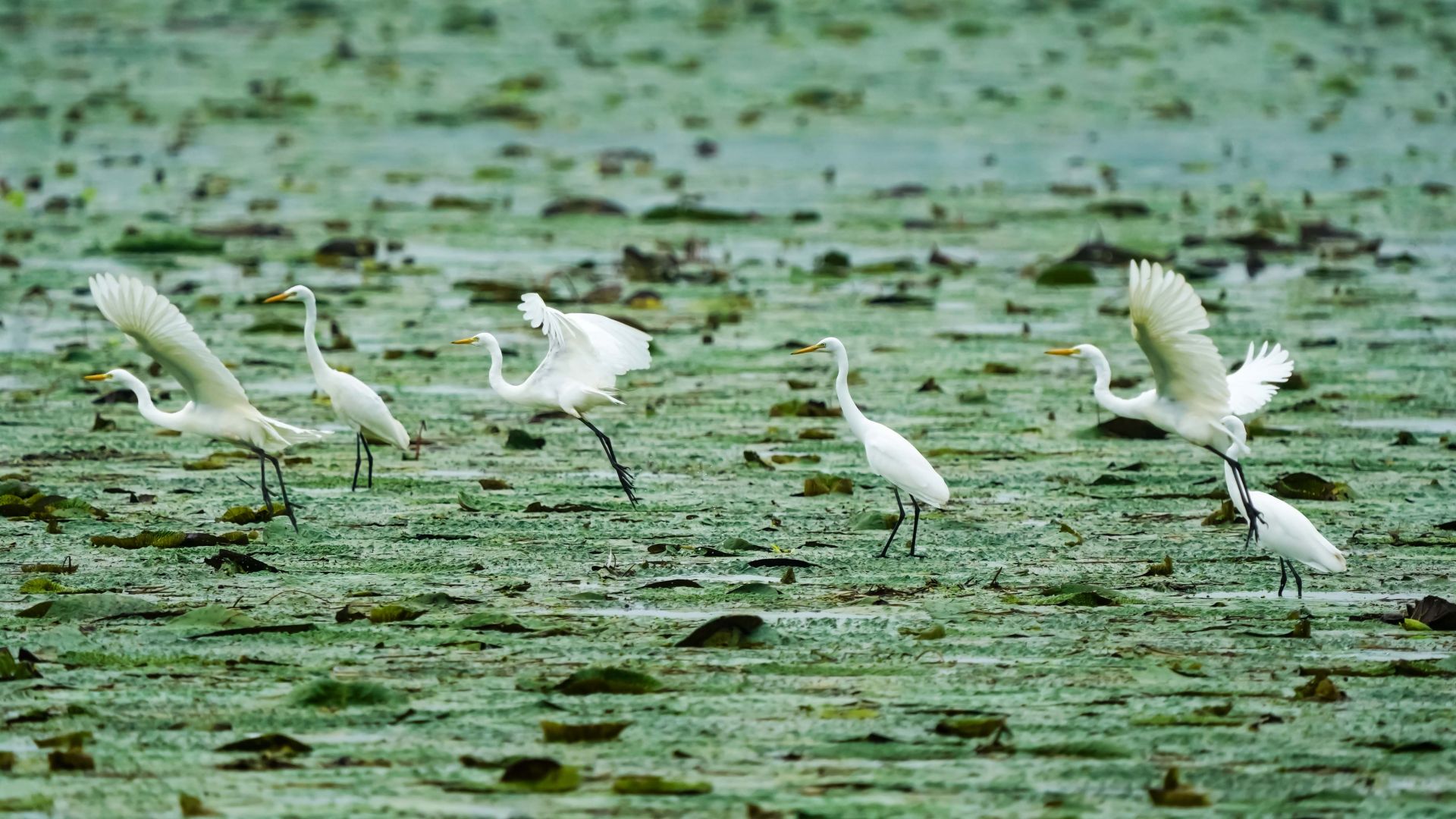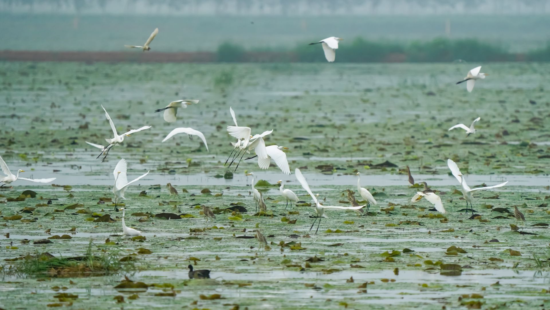 初秋,在大河湾的芡实塘里,有几十只白鹭、池鹭在芡实的叶面上捕捉芡实塘的鱼虾吃,洁白的羽毛与绿色的芡实叶共绘出一幅美丽的生态画卷。 李思 摄