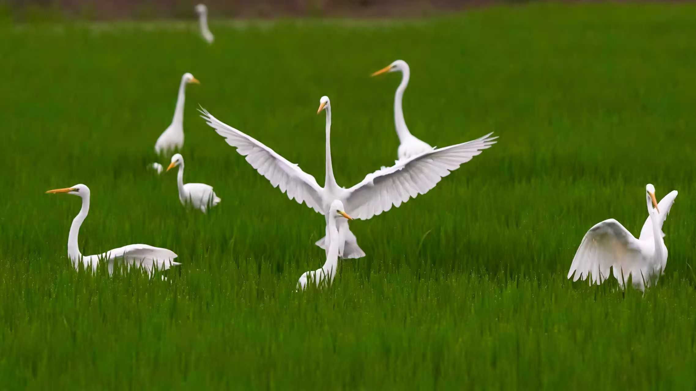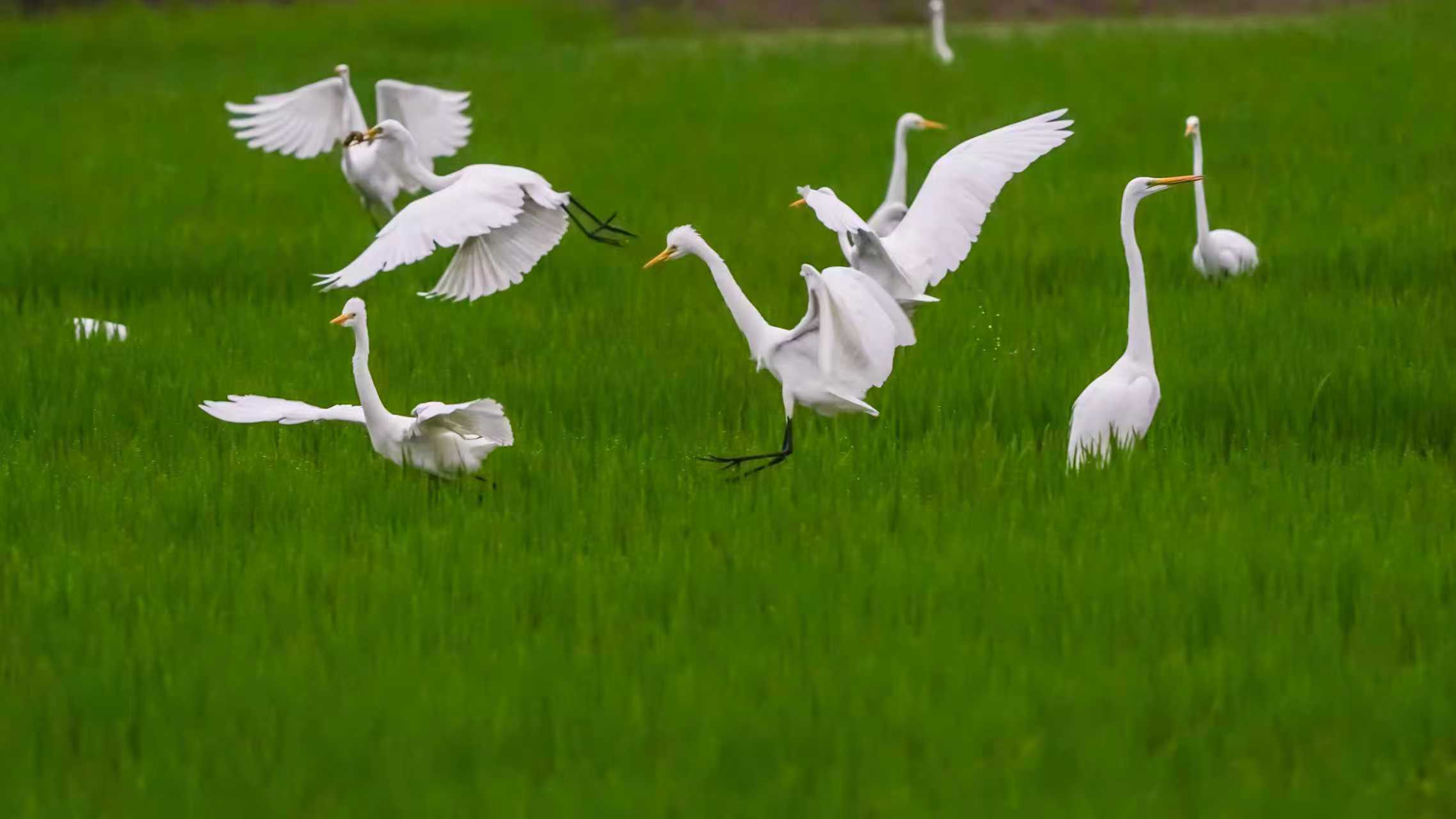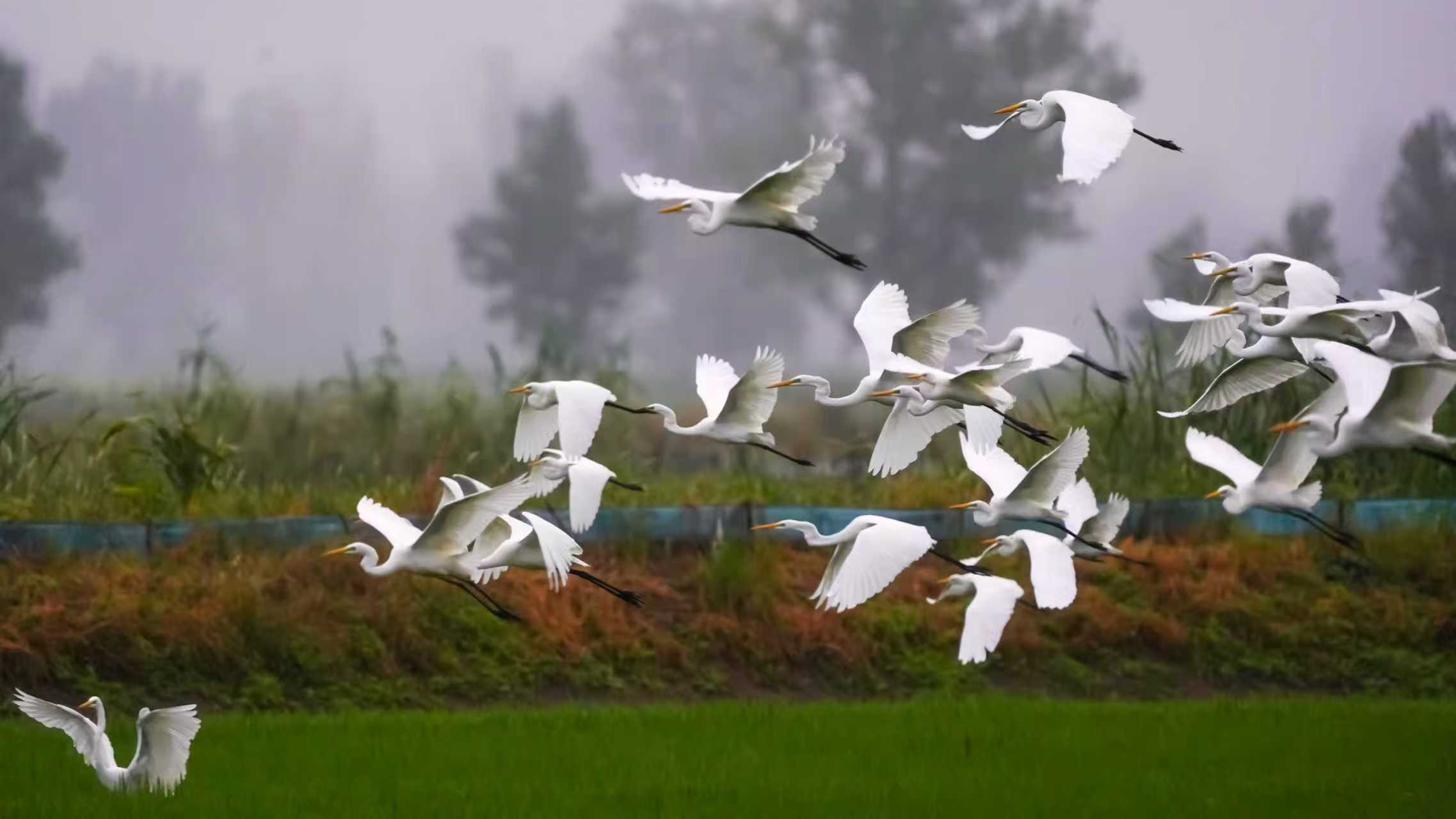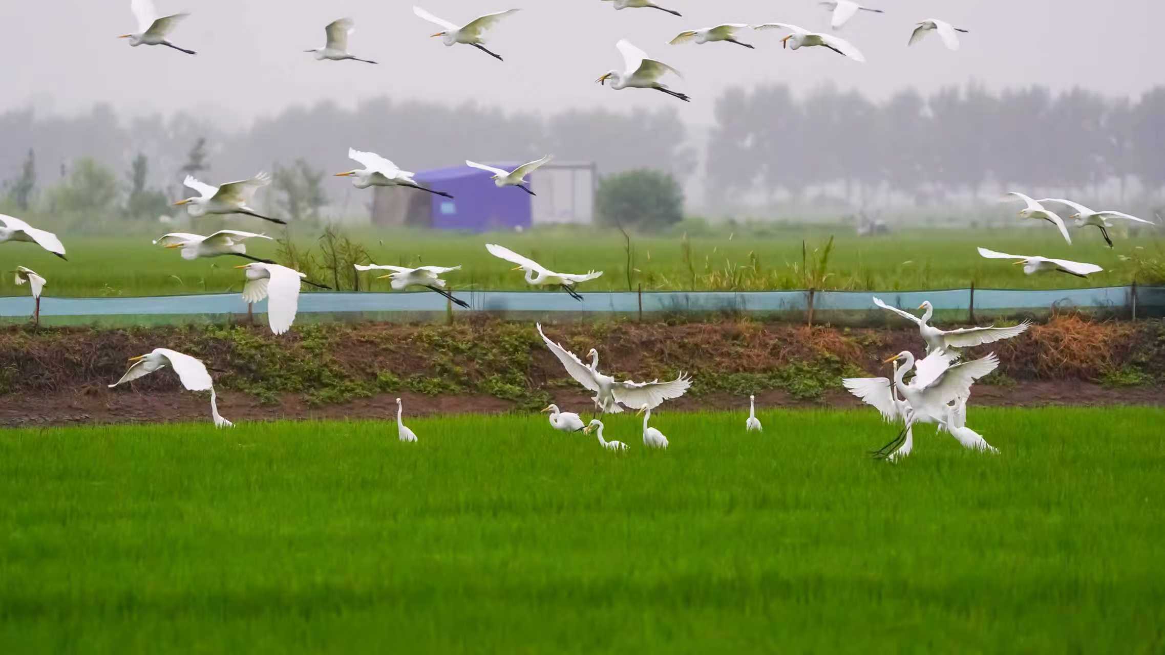 在怀远大河湾的虾稻田里,一群白鹭停留在虾稻田里觅食,绿油油的秧苗与白色的羽毛勾绘出一幅生态画卷。 李思 摄