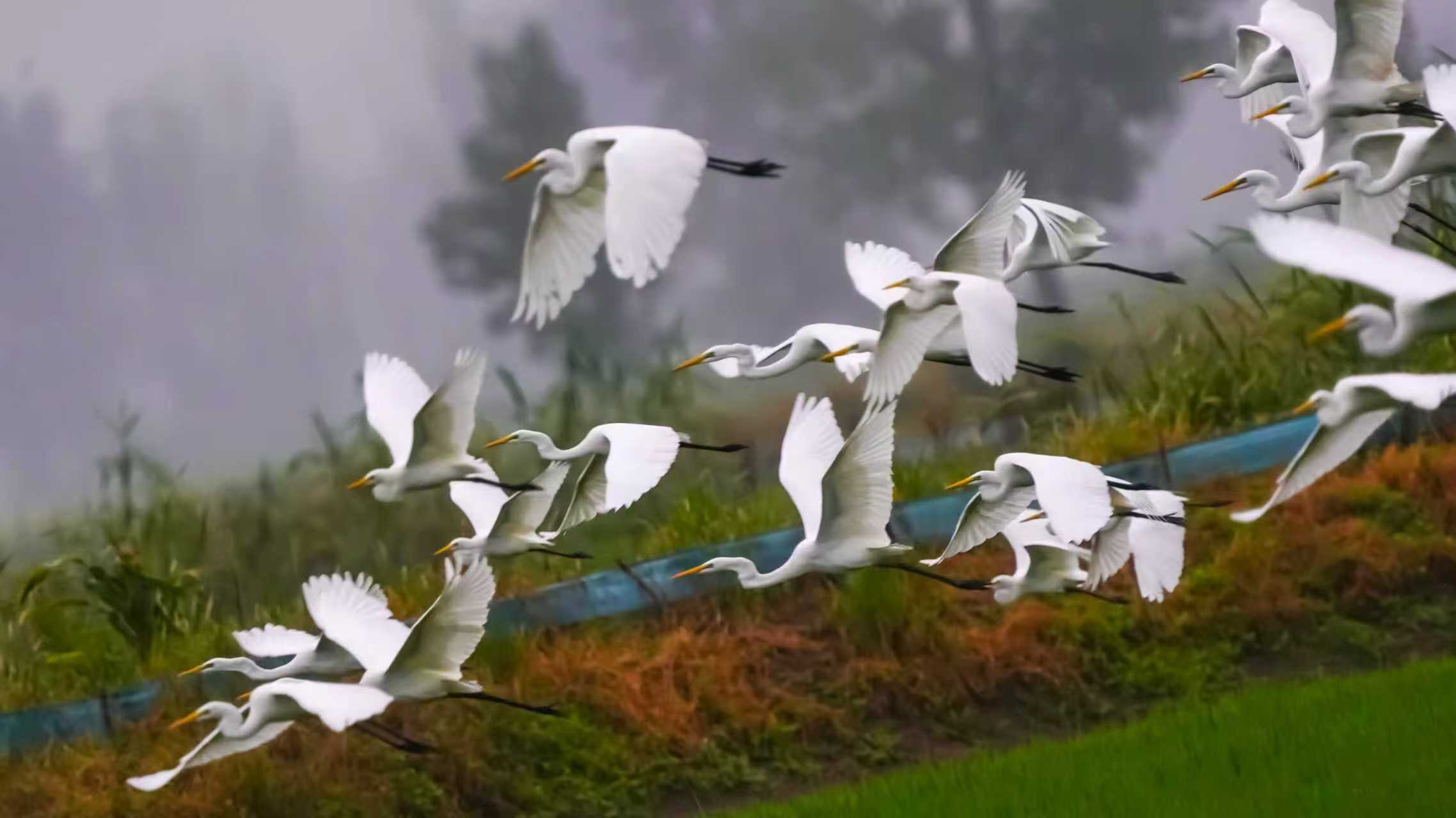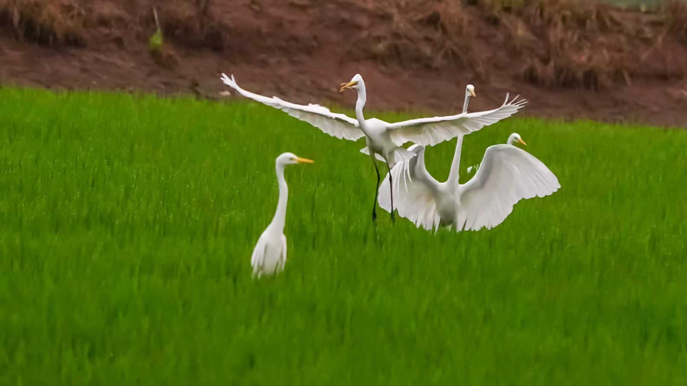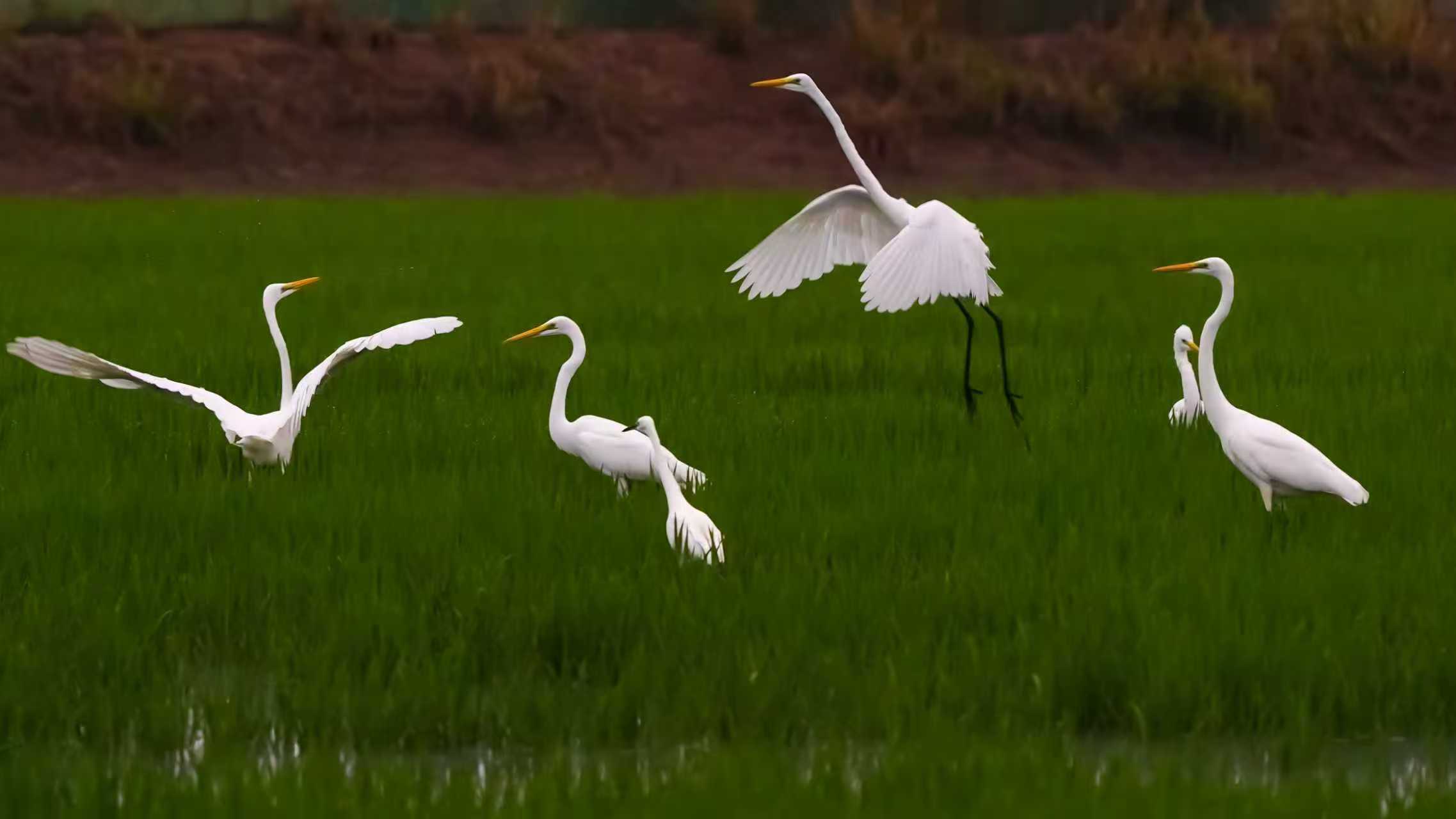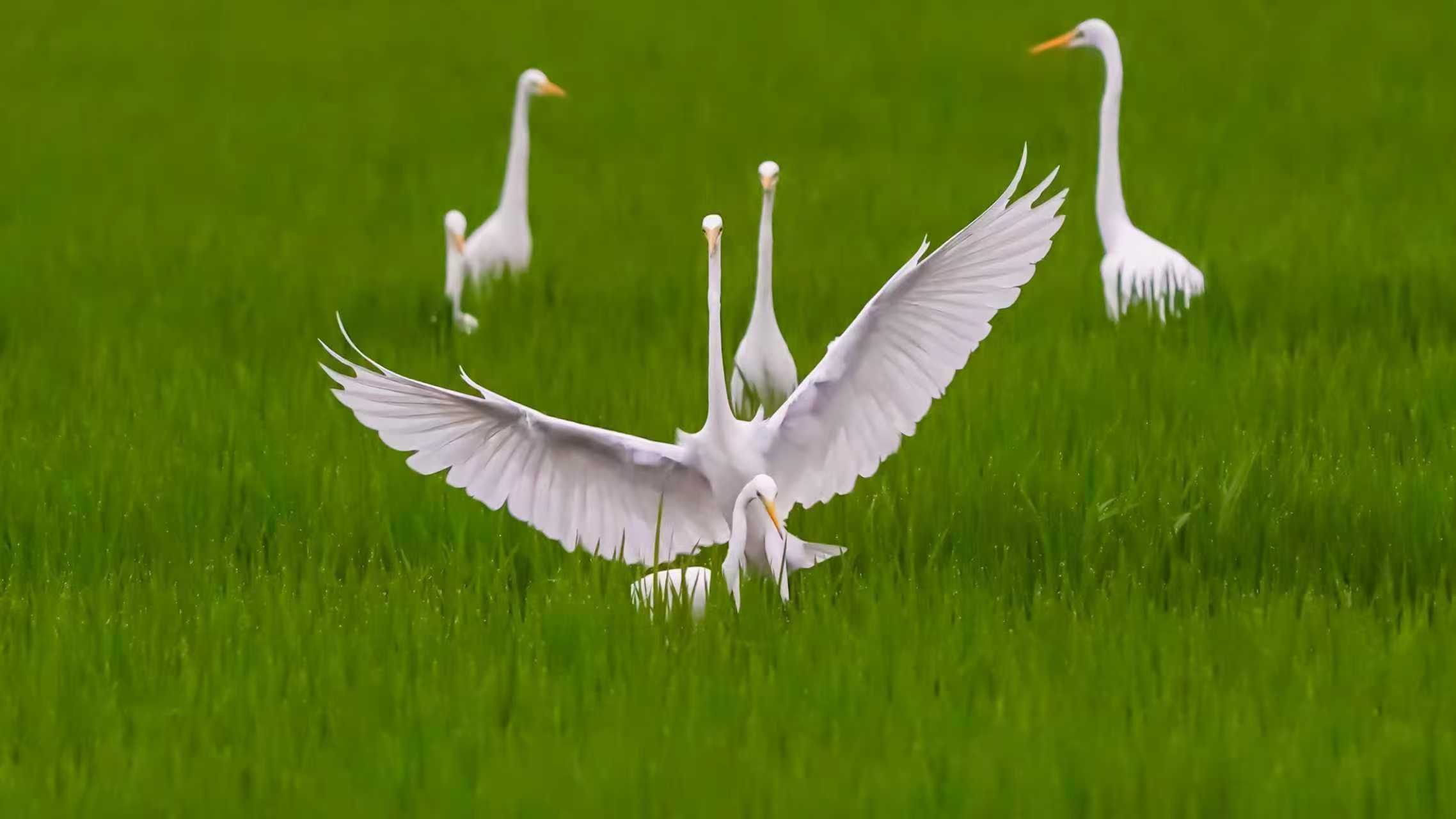在怀远大河湾的虾稻田里,一群白鹭停留在虾稻田里觅食,绿油油的秧苗与白色的羽毛勾绘出一幅生态画卷。 李思 摄