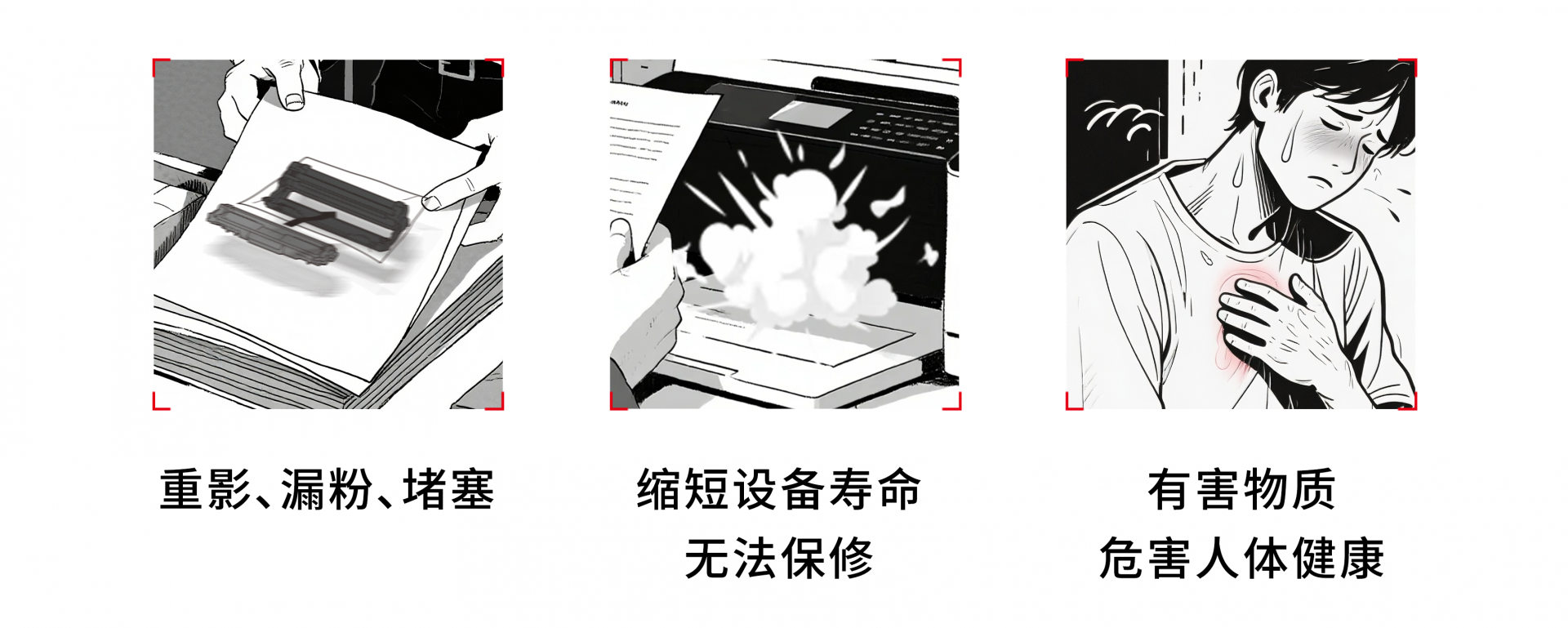 使用假耗材极易引发打印重影、漏粉、堵塞等运行问题,影响文档输出质量和办公效率;同时,假耗材还会对打印机核心组件造成持续损害,加速设备老化,且此类故障不在原厂保修范围之内。更值得警惕的是,部分假耗材含有害化学物质,长期接触可能危害员工健康。(配图)