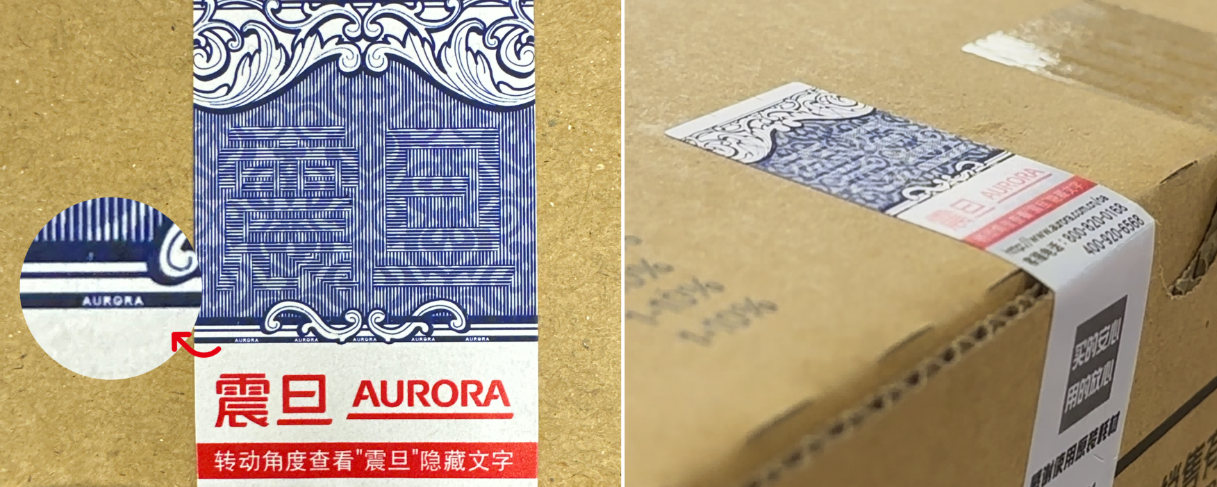 微缩纹理:手机放大镜模式下,防伪标签可见清晰“AURORA”微缩文字;