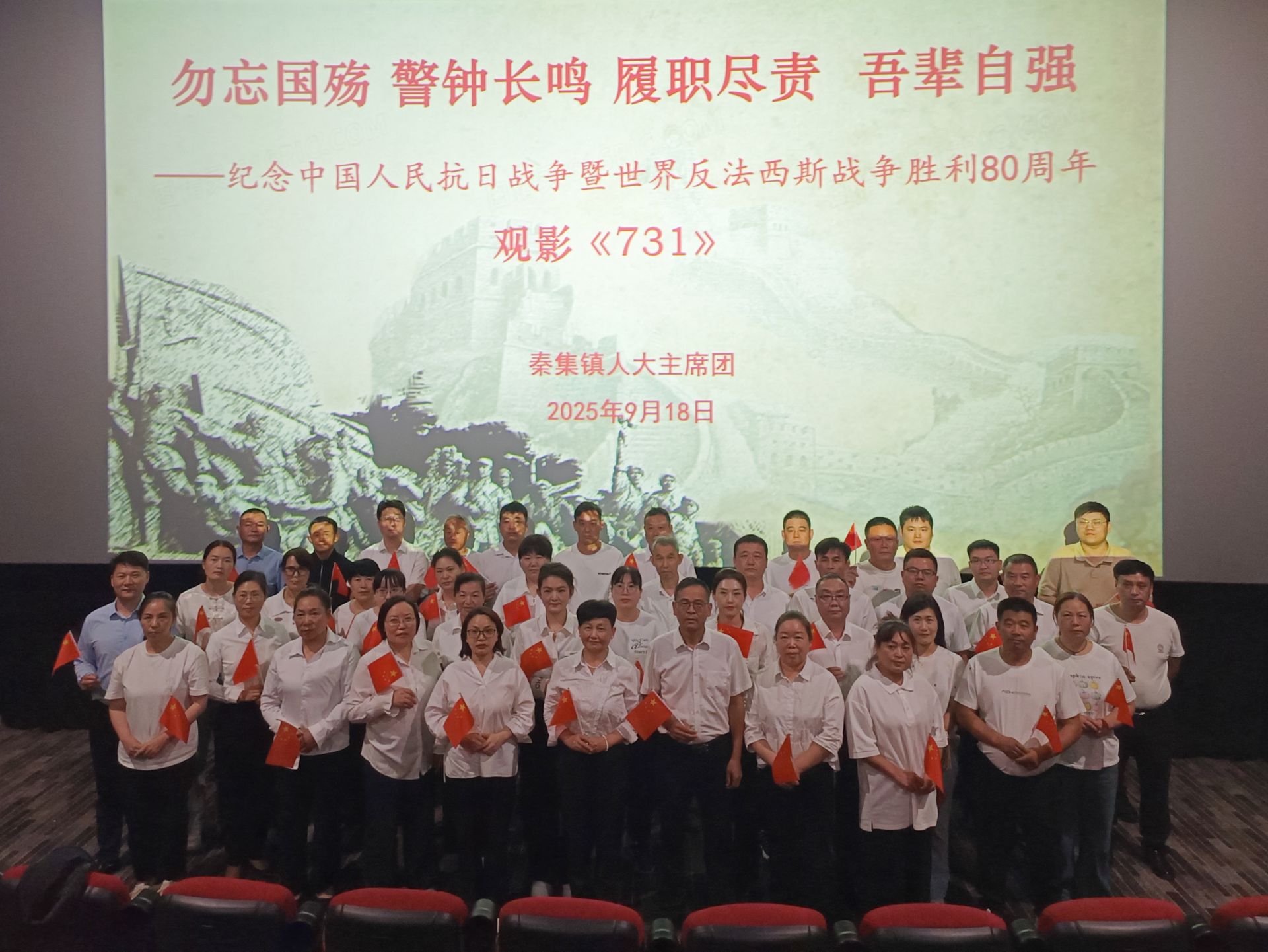 为纪念中国人民抗日战争暨世界反法西斯战争胜利80周年,强化爱国主义教育,9月18日下午,秦集镇人大主席团开展以“勿忘国殇 警钟长鸣 履职尽责 吾辈自强”为主题的爱国主义教育观影活动,组织市、区、镇三级人大代表50余人集体观看爱国主义题材电影《731》。