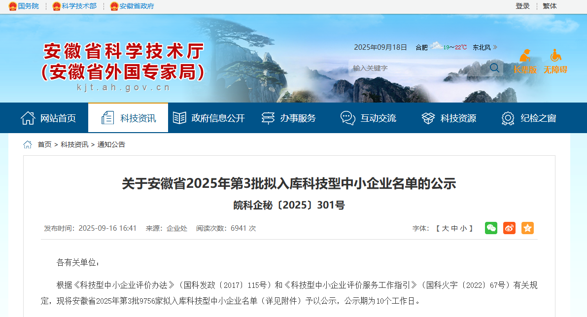 近日,安徽省科学技术厅根据《科技型中小企业评价办法》(国科发政〔2017〕115号)和《科技型中小企业评价服务工作指引》(国科火字〔2022〕67号)有关规定,现将安徽省2025年第3批入库科技型中小企业名单(详见附件)予以公示。中闰汉宇数字科技(安徽)有限公司(以下简称“中闰汉宇数字科技”)顺利通过评审,成功入围安徽省2025年度国家级科技型中小企业。