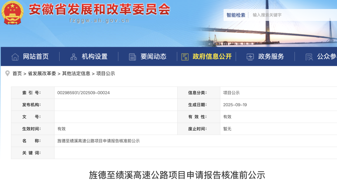 9月19日,安徽省发改委网站发布《旌德至绩溪高速公路项目申请报告核准前公示》。