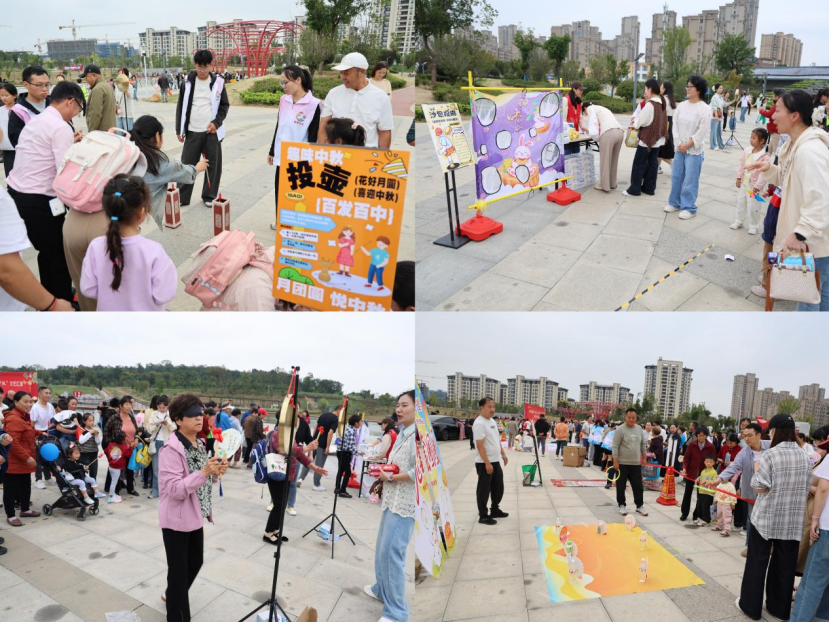 更具巧思的是融入节日特色与科普意义的互动环节:山南新村社区的“趣味月饼投投乐”将中秋元素与游戏结合,参与者们把“月饼”投向目标区域,成功即可获得精美月饼奖励,让大家在游戏中提前品味中秋的甜蜜;文竹苑社区的“消防飞行棋”创意十足,棋盘上设置了消防知识问答、安全场景判断等环节,居民们在掷骰子、走棋盘的过程中,不知不觉学习了消防安全知识,实现“娱乐即科普”;科苑社区的“跃‘月’欲试”跳跃游戏、天河路社区的“滚滚乐”“玉兔套萝卜”等游戏,也以轻松有趣的形式吸引了大批居民参与,尤其是孩子们蹦蹦跳跳、积极互动的身影,成为游园会上最鲜活的风景。