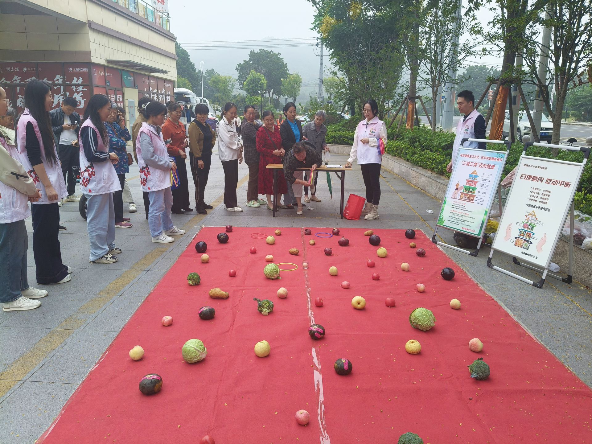最受欢迎的当数蔬菜套圈游戏环节。工作人员将土豆、番茄、洋葱等15种新鲜蔬菜摆成方形靶区,居民通过套圈赢取蔬菜,游戏过程中,工作人员穿插讲解蔬菜的营养价值,如“深色蔬菜富含维生素A,对眼睛好”“根茎类蔬菜膳食纤维丰富,能促进消化”。居民王阿姨在参与游戏后笑道:“既玩了游戏,又学了知识,套中的菜回家炒着吃,开心,还健康!”