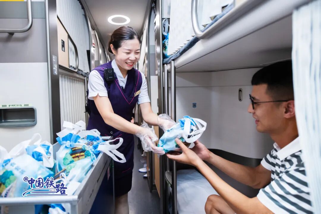 车上为旅客免费提供“动卧轻食”,包括饮料和小吃,还准备了一次性洗漱用品。
