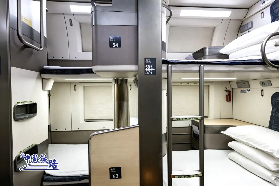 每个铺位配备三孔、两孔插座以及USB充电口,满足电子设备充电需求。旅客还可自主控制开关铺位上方的顶灯和阅读灯。