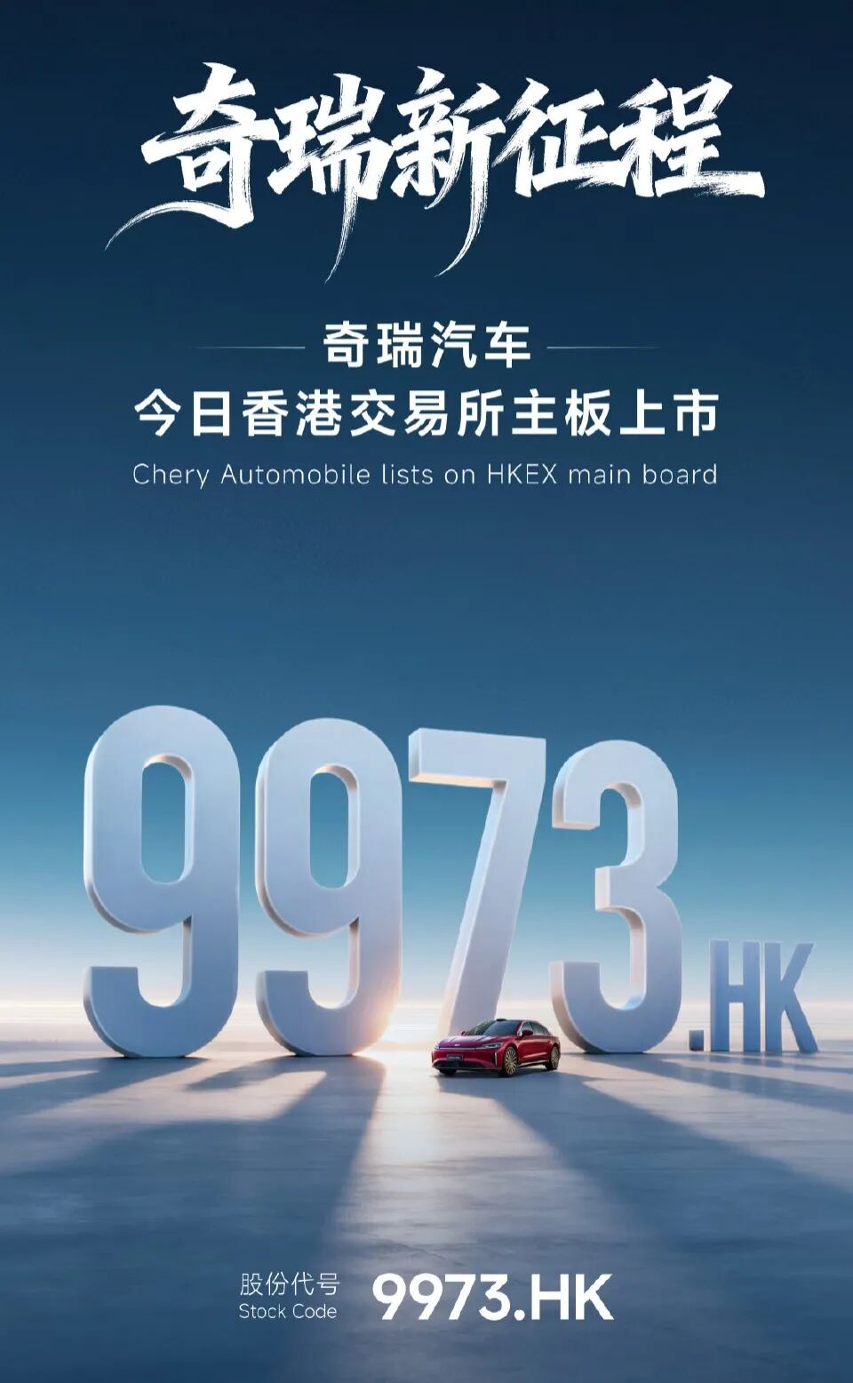 9月25日,奇瑞汽车在港交所正式挂牌上市,股票代码9973.HK。此次上市,奇瑞汽车以30.75港元/股的招股价上限定价,募资规模达91.4亿港元,成为年内港股市场规模最大的车企IPO。