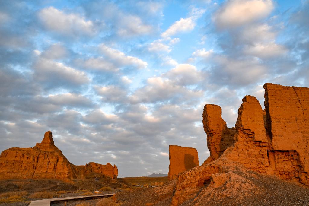 “克孜尔尕哈”意为“红色哨卡”。夕阳下,这座汉代军事设施的夯土墙体被映照得棱角分明,泛着淡淡的金红色。“站在这里,仿佛看到了当年的烽火传讯。”一名游客感慨地说。