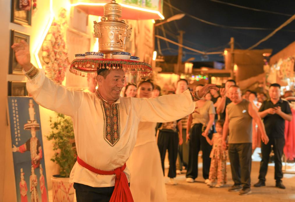 夜幕降临,烟火气息在库车老城弥漫。广场上传来欢快的乐曲声,舞者头顶铜盘铜壶,脚步轻快,将迎宾之礼——萨玛瓦尔舞展现在游客面前,掌声与欢笑声此起彼伏。