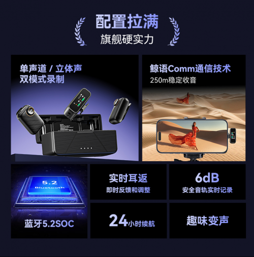 蓝牙5.2升级芯片SOC+鲸语Comm通信技术,250m稳定直播不断连