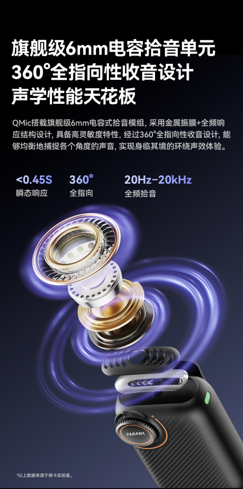 旗舰级6mm电容拾音单元,360°全指向性收音设计