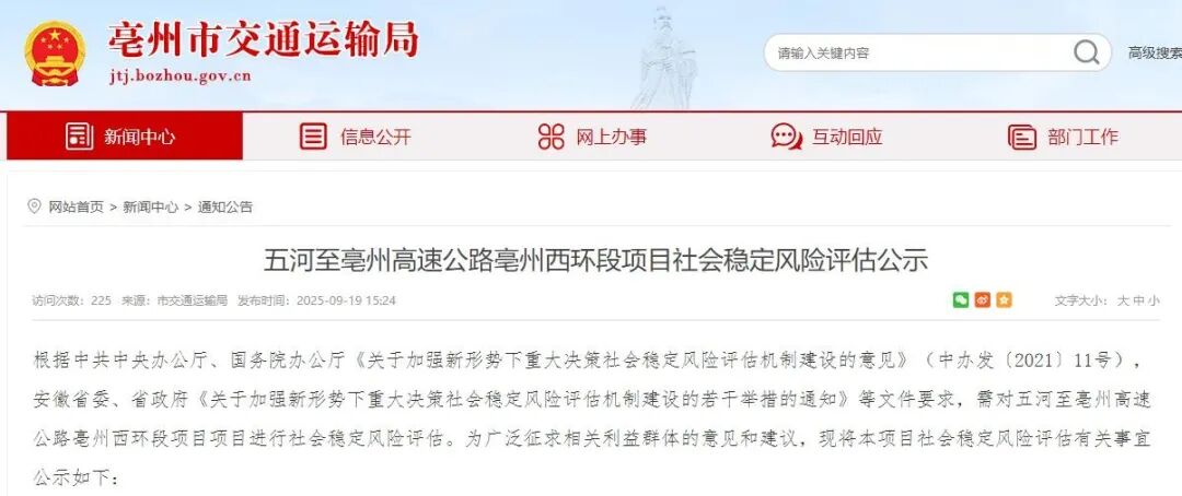 为完善亳州市西部区域高速公路网络布局,加强谯城区与河南省的省际交通联系,进一步促进皖北地区经济社会高质量发展,安徽省发展和改革委员会已正式批复五河至亳州高速公路亳州西环段项目立项。该项目代码为:2407-340000-04-01-702001。