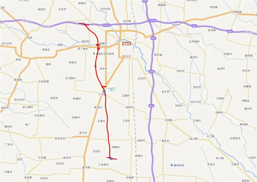 项目起于亳州市谯城区魏岗镇西南侧与G1516盐洛高速交叉处,自北向南沿十八里镇东、亳州市中心城区西、十河镇东、双沟镇东,终点位于淝河镇东北侧与S62亳郸高速交叉处。