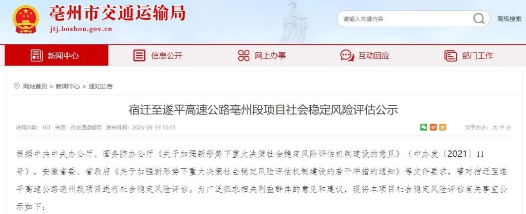 为增强皖北地区内部互联互通水平,促进亳州市域一体化发展,改善蒙城、利辛等县域节点内部及对外通达条件,安徽省发展和改革委员会已正式批复宿迁至遂平高速公路亳州段项目立项。该项目代码为:2406-340000-04-01-921432。