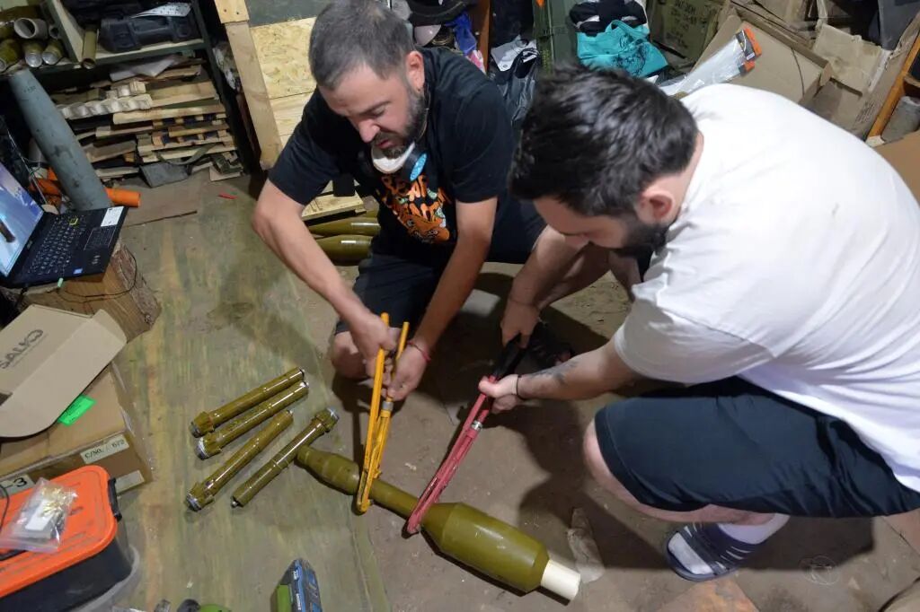 2025年8月12日,乌军人员在乌克兰苏梅州前线地区改装无人机弹药。新华社发(彼得·德鲁克摄)