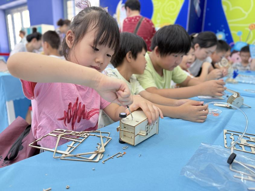 此外,馆内还开设“国庆·小创客 玩转大梦想”主题科学工坊,通过开放式STEM实验,让孩子们在动手实践中激发科学兴趣,树立科技报国的志向。