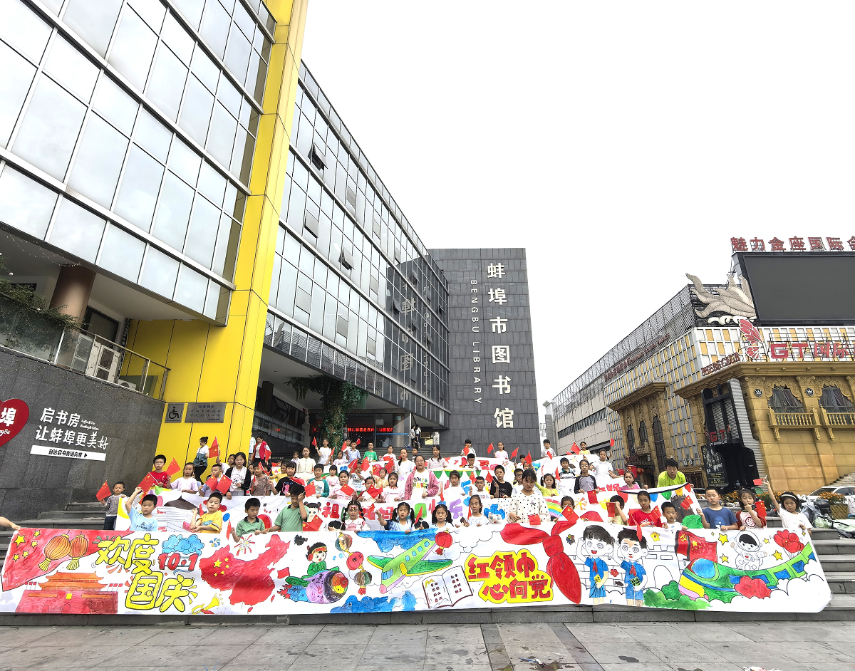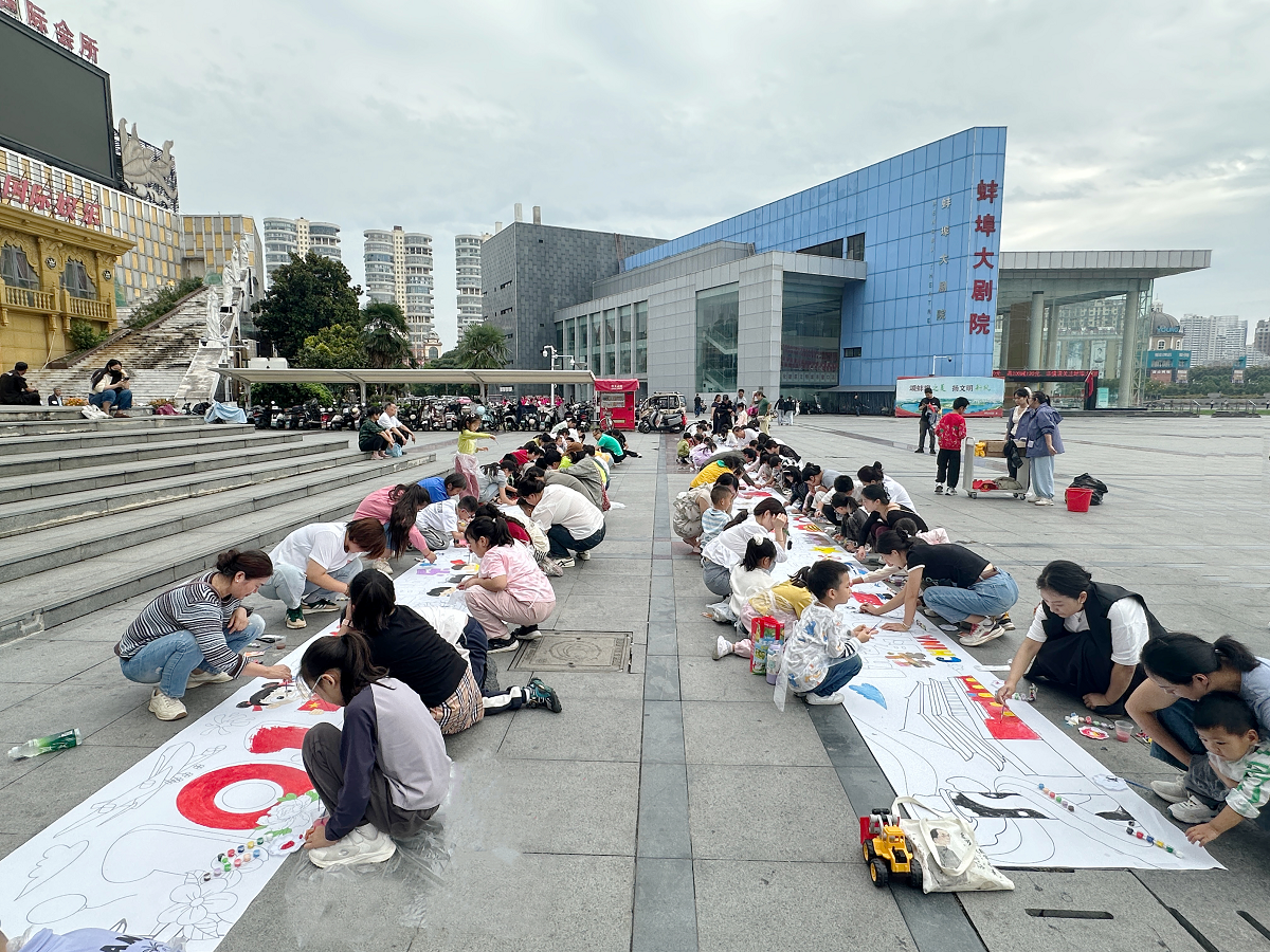 金秋送爽,丹桂飘香。10月1日下午,蚌埠市图书馆前,40米长的洁白画布如银练般铺开,近百位读者齐聚一堂,以笔为媒、以彩为语,将对祖国的真挚祝福倾注于笔墨之间。
