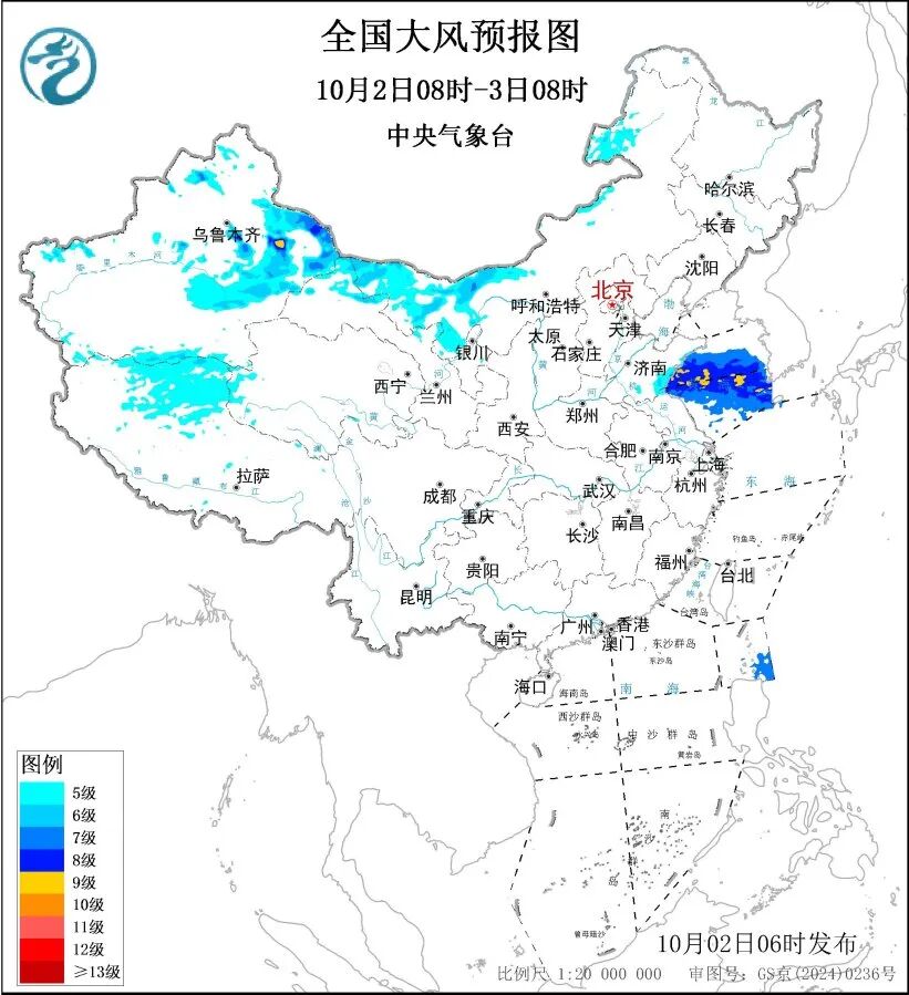 10月3日08时至4日08时,新疆东部和南疆盆地、甘肃西部、内蒙古西部和北部等地部分地区有5-6级风,新疆山口地区风力可达7~8级;黄海东南部海域将有7~8级、阵风9~10级的大风。巴士海峡、南海东北部和中东部海域将有8~10级,阵风11~12级的大风。