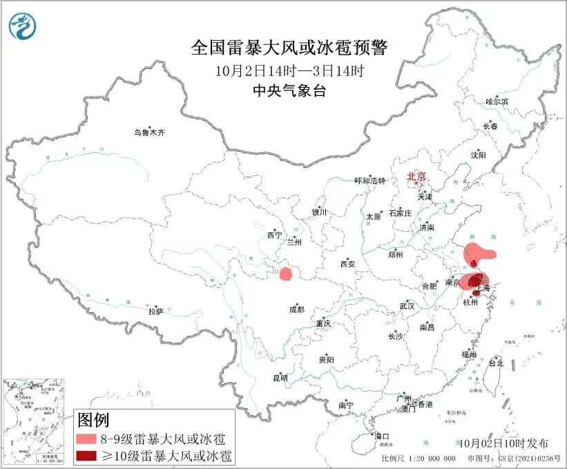 中央气象台10月2日10时继续发布强对流天气蓝色预警:预计10月2日14时至3日14时,江淮东部、江南东北部等地的部分地区将有8级以上雷暴大风或冰雹天气,其中,江苏中南部、上海北部和西部、浙江北部等地的部分地区将有10级以上雷暴大风,最大风力可达11级以上;西南地区东北部、江汉西部、江淮东部、江南东北部等地的部分地区将有小时雨量大于20毫米的短时强降水天气,其中,江苏中南部、上海北部和西部等地的部分地区小时雨量大于50毫米,最大可达60毫米以上。