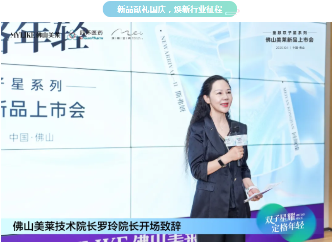 活动伊始,佛山美莱技术院长罗玲院长发表开场致辞。罗玲院长首先向在场嘉宾致以国庆祝福,她提到, “童颜双子星”「回颜臻」与「斯弗妍」的重磅上市,是多轮临床验证、技术打磨的结晶,更是 “以科学赋能美丽,以品质守安全”的成果,每一个环节都承载着我们对美丽的极致追求。