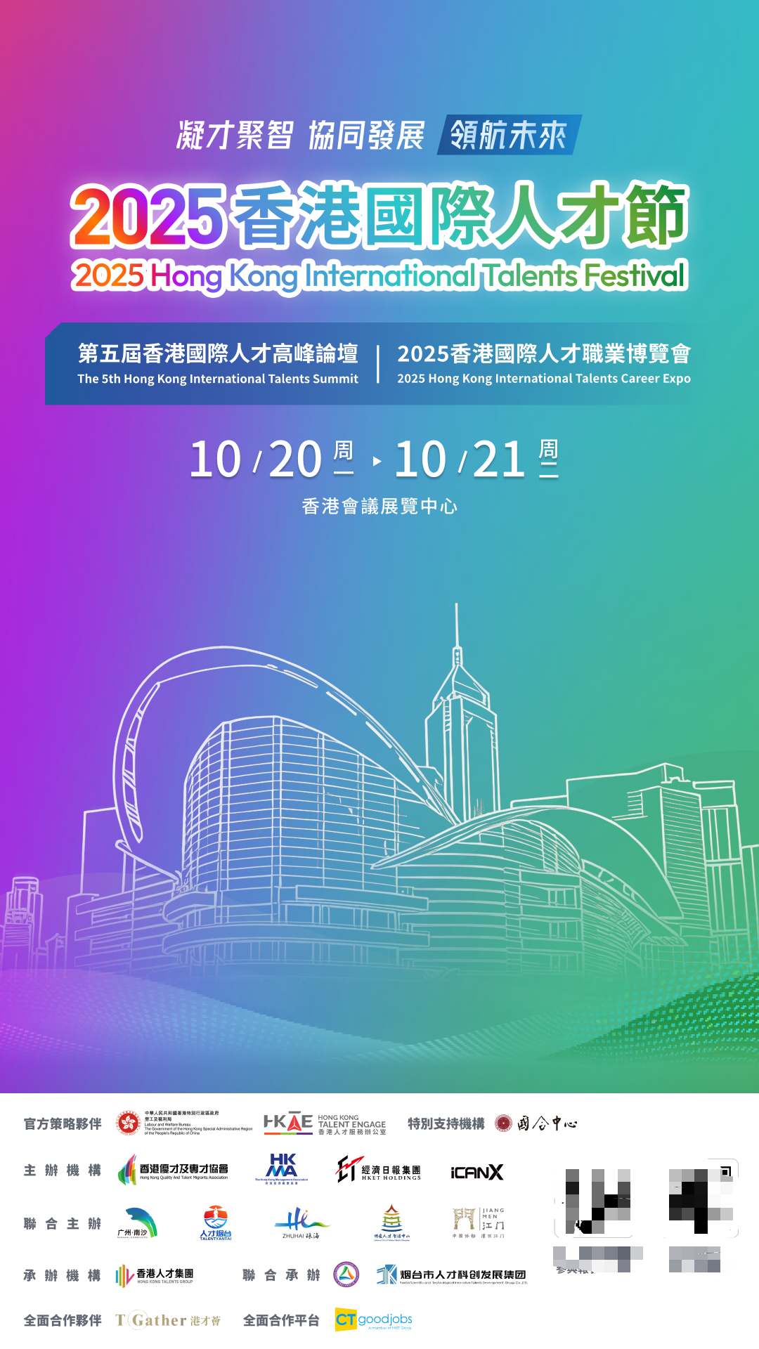 2025香港国际人才节由香港特区政府劳工及福利局、香港人才服务办公室作为官方战略伙伴,国际合作中心给予特别支持,香港优才及专才协会、香港管理专业协会、香港经济日报、iCANX主办,广州南沙、烟台、珠海、中山、江门等内地城市联合主办,香港人才集团承办,粤港澳人才协作办公室及烟台市人才科创发展集团联合承办,并由港才荟TGather作为全面合作伙伴,CTgoodjobs担任全面合作平台。人才节广邀中央政府有关领导、香港特区政府主要官员、内地相关政府和国际组织主要官员、政商学研各界知名人士、海内外高端人才齐聚一堂,积极搭建国际高端人才交流、对接及合作平台。