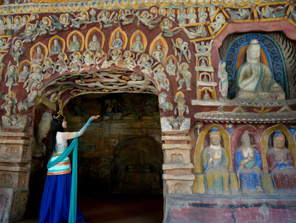 10月9日,在位于今潮8弄的户外展区,参观者游览云冈第12窟“音乐窟”的1:1复制洞窟。新华社记者 刘颖 摄