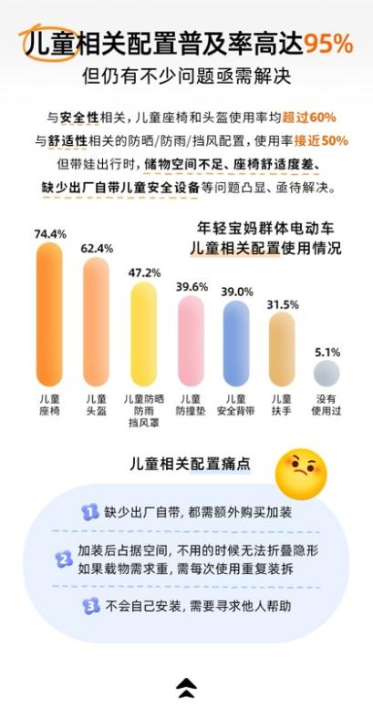 在宝宝树的调研中也反映出一些实际使用中的痛点。单人出行时,储物空间不足、车辆笨重、推行不便等问题较常见;带孩子出行时,则更关注儿童乘坐安全性、座椅舒适度及应对天气变化的需要。尽管儿童座椅、头盔等配件使用率不低,不少用户仍认为其在安装便捷性与空间占用方面有待改进。
