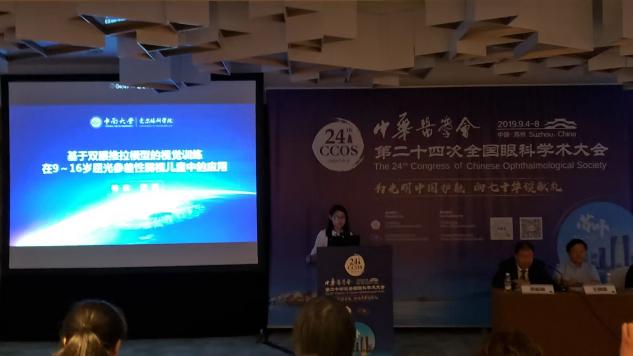 林泉教授指导其中南大学研究生曾瑶在第二十四次全国眼科学术大会报告《基于双眼推拉模型的视觉训练在9-16岁屈光参差性弱视儿童中的应用》,提出了视觉训练新模式。尤其是对于传统方法效果不佳的大龄患儿。获得了同行的关注和认可,并将惠及更多弱视儿童。