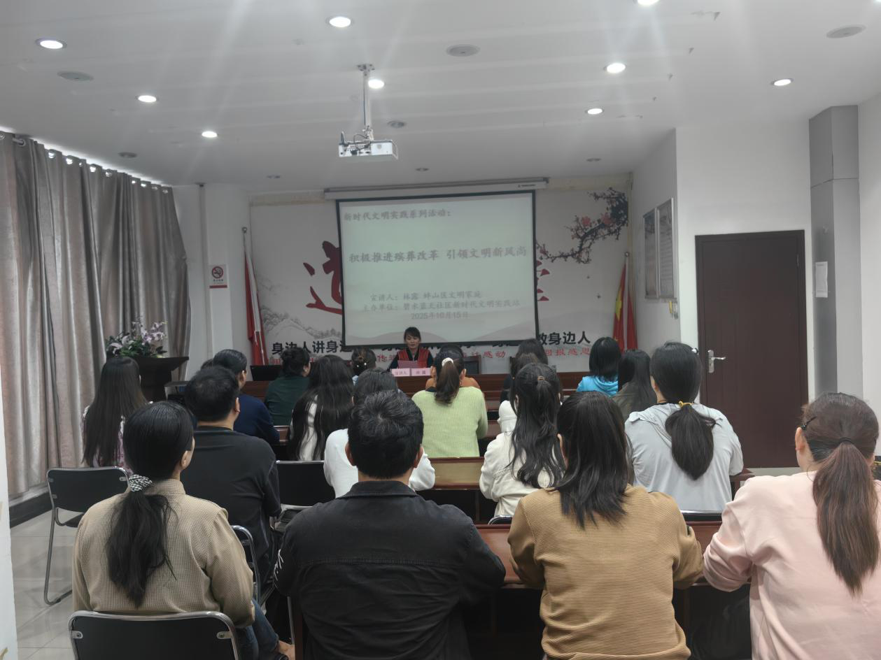近日,碧水蓝天社区新时代文明实践站特邀蚌山区“文明家庭”代表林露开展开展“积极推进殡葬改革,引领文明新风尚”宣讲活动,讲解殡葬改革的重要意义,详细介绍文明殡葬的方式方法,引导大家破除“厚葬薄养”旧观念,树立“厚养薄葬”新意识。(刘爱敏) 0