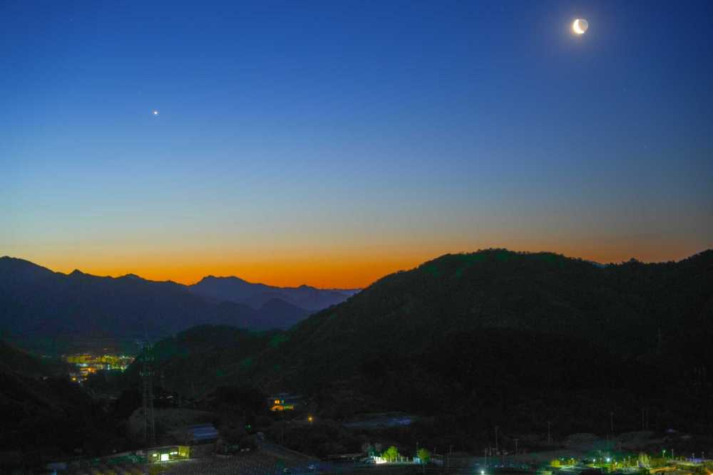 2025年4月24日,在北京怀柔拍摄的启明星伴月。(王俊峰 摄)