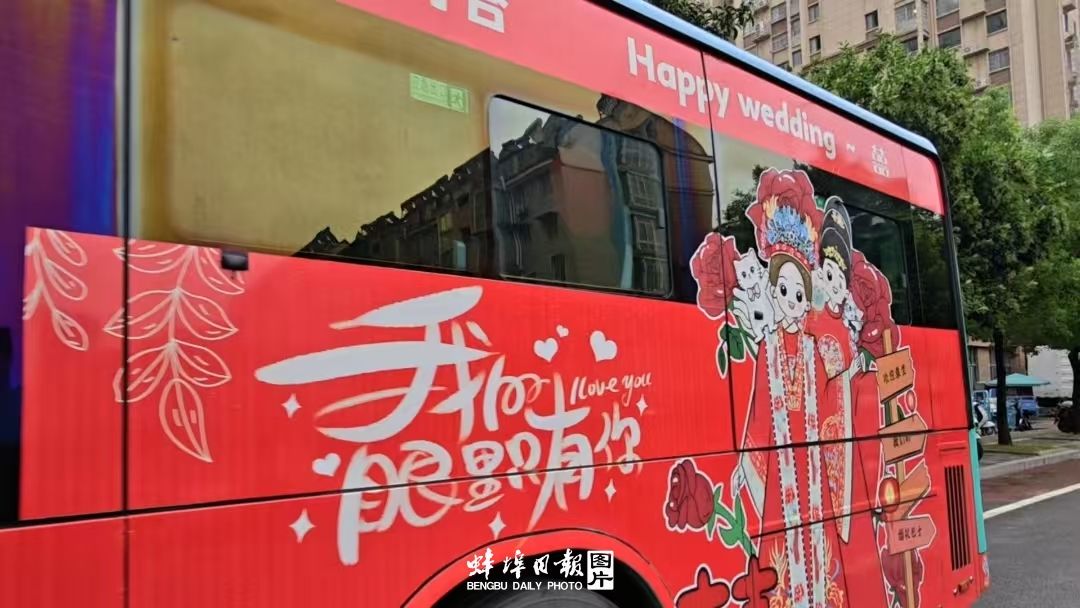今年30岁的窦梦珊曾在蚌埠公交集团担任驾驶员,五年半的职业生涯里,她每天清晨从场站出发,途经淮河路、延安路等站点,将乘客安全送达目的地。这份与城市朝夕相伴的工作,让她对公交车感情深厚:“在车队时听说同事用公交接亲,当时就想,我结婚也要用这种特别的方式。”确定婚期后,她联系原单位,工作人员不仅为她选了车况完好的车辆,还帮忙用大红花、喜字彩带装饰车身,车内布置气球与轻纱,温馨又喜庆。