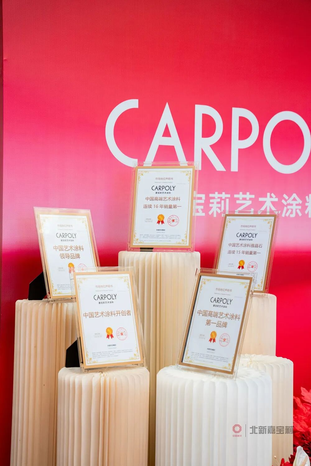随后,汪继欣现场宣布:嘉宝莉艺术涂料五项品牌认证成立。北新嘉宝莉全装修产品事业部总经理罗志清、全装修产品事业部副总经理施以森、全装修产品事业部副总经理谢锦州、经销商代表谭孔进、嘉宝莉战略品牌部谭彩霞,分别从汪继欣手中接过了“中国艺术涂料领导品牌”、“中国艺术涂料开创者”、“中国高端艺术涂料第一品牌”、“中国艺术涂料雅晶石连续15年销量第一”、“中国高端艺术涂料连续16年销量第一”证书。