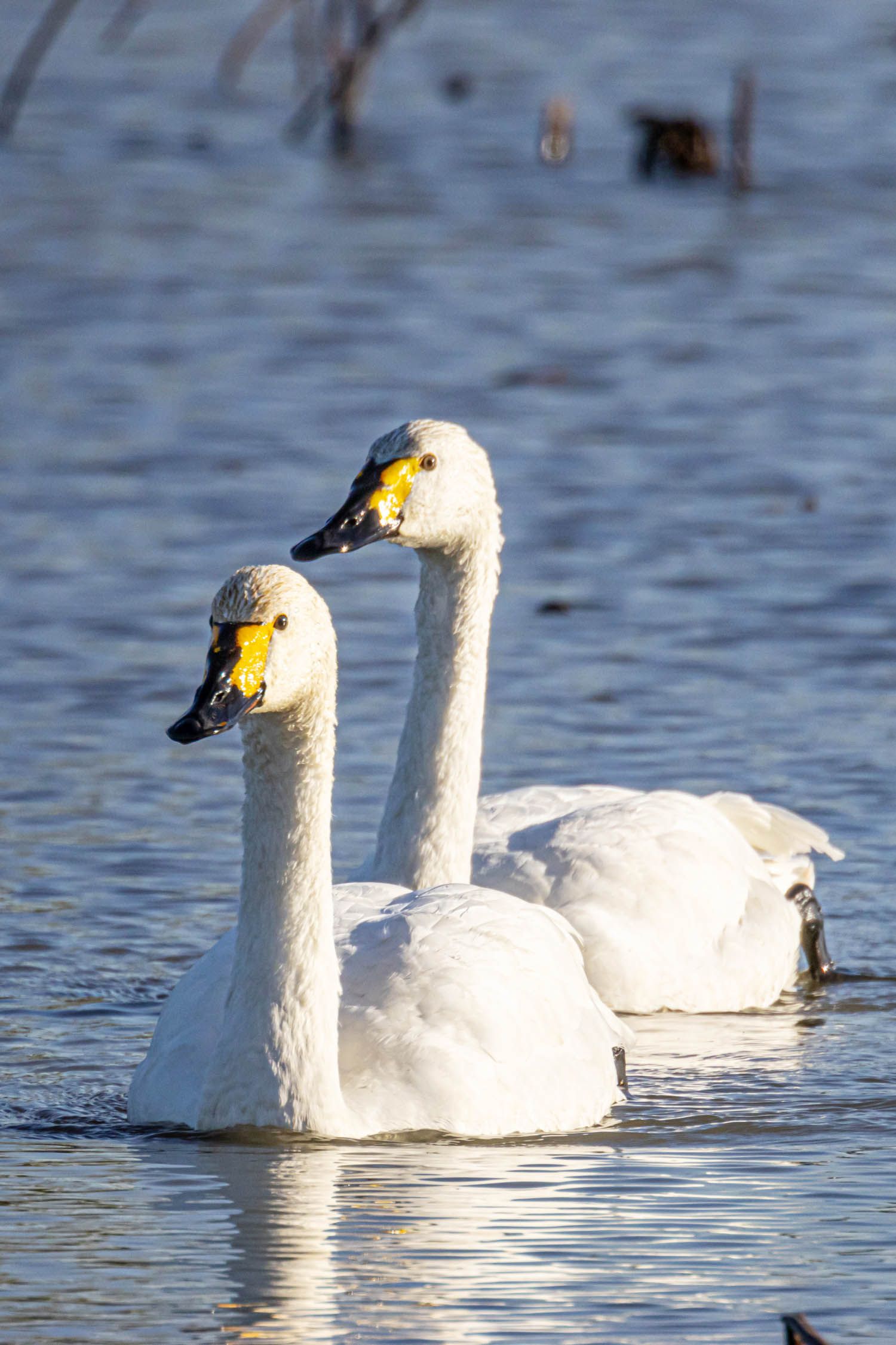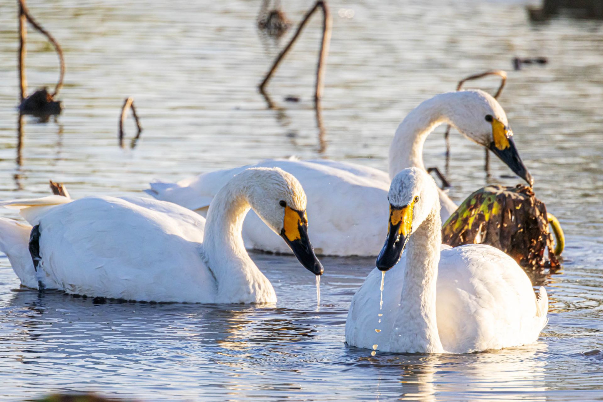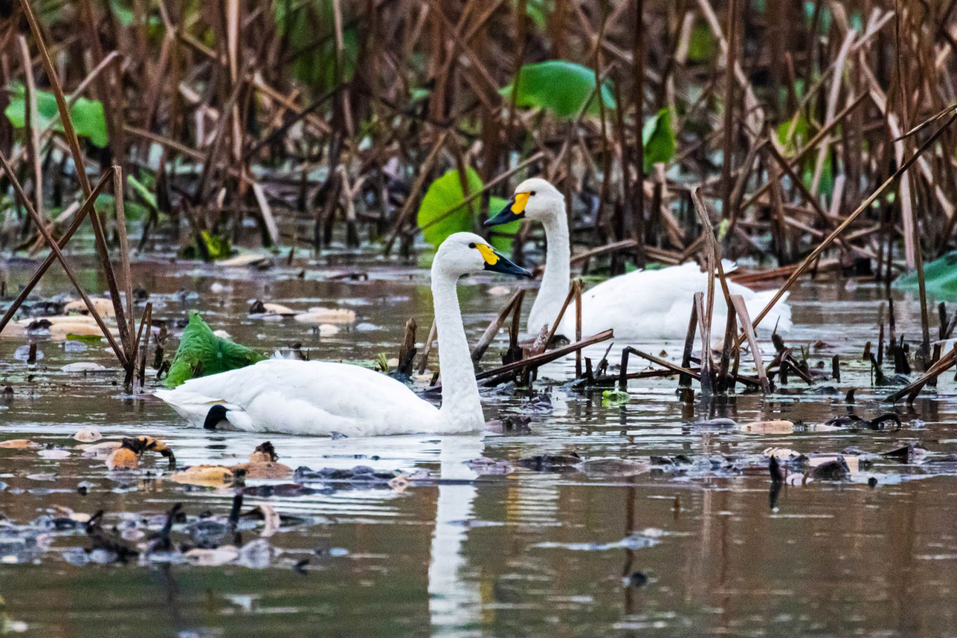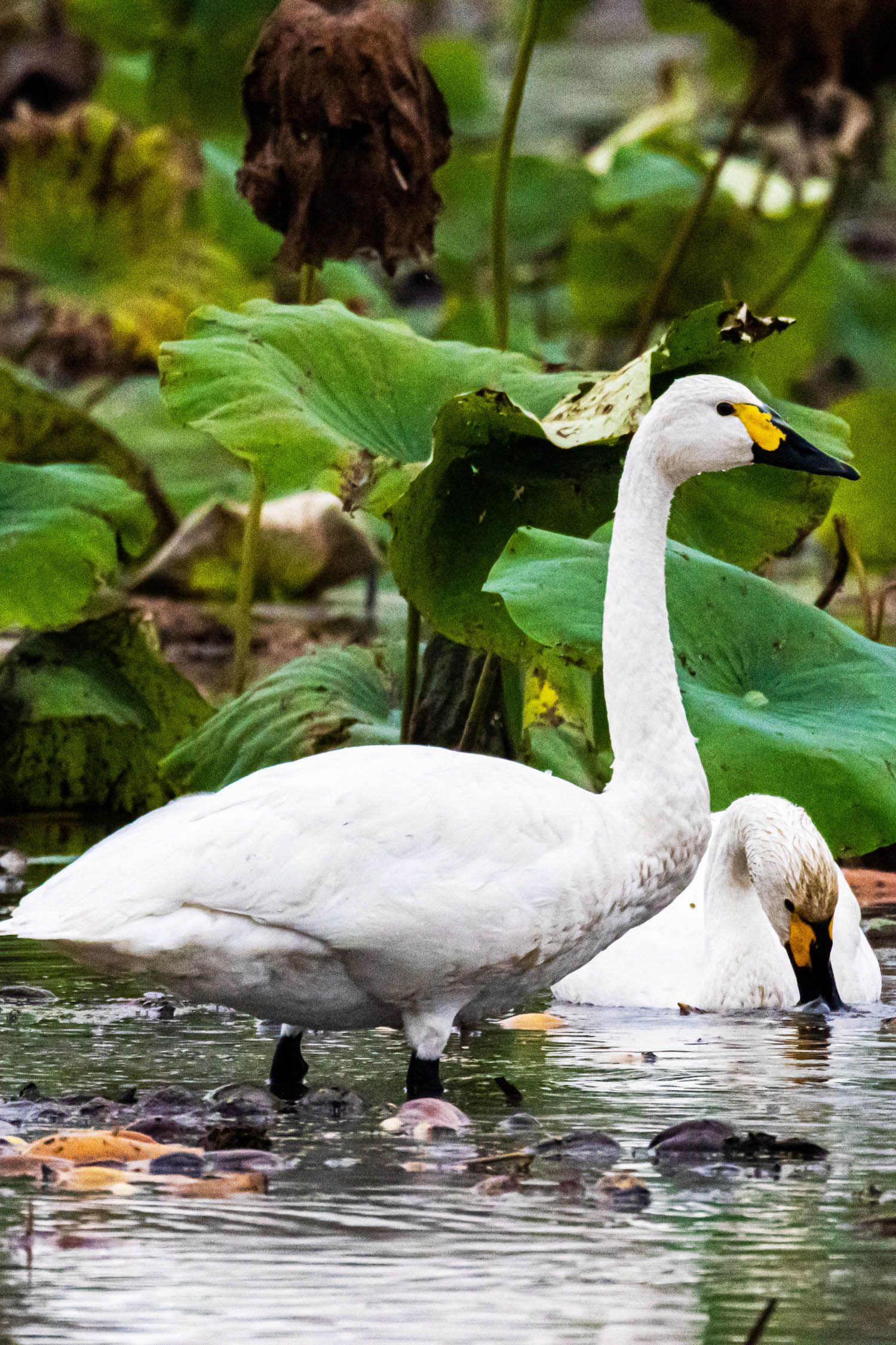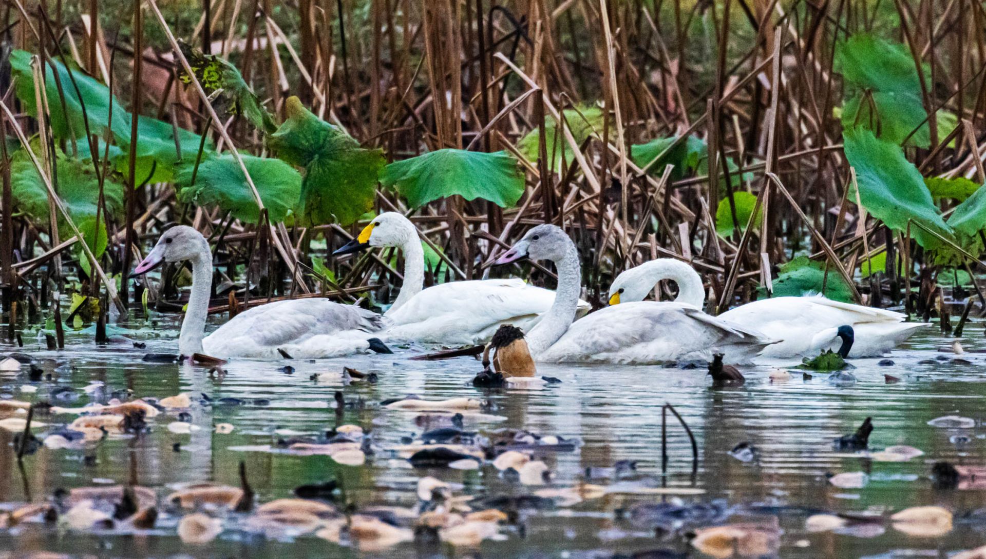 成年小天鹅带着小天鹅亚成鸟在荷塘里觅食。小天鹅成鸟全身羽毛白色,喙前端黑色、后端黄色。亚成鸟虽然个头与成鸟接近,但头颈羽毛灰色,喙粉红色,很容易辨别。 马孝才 摄